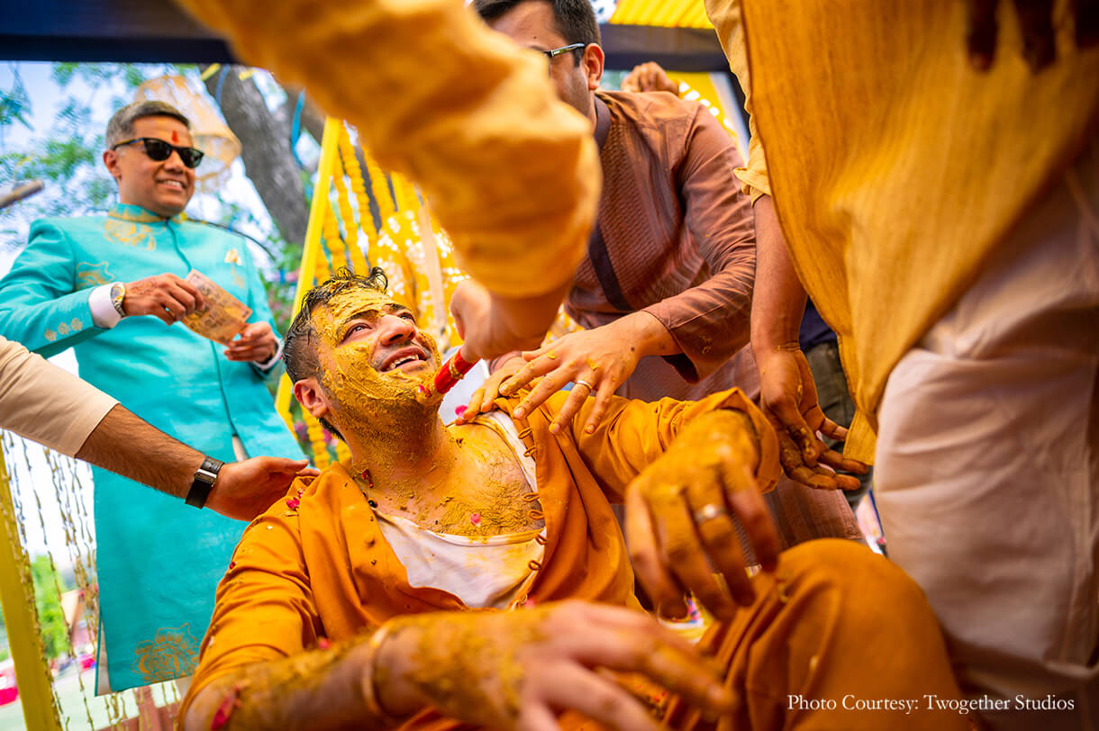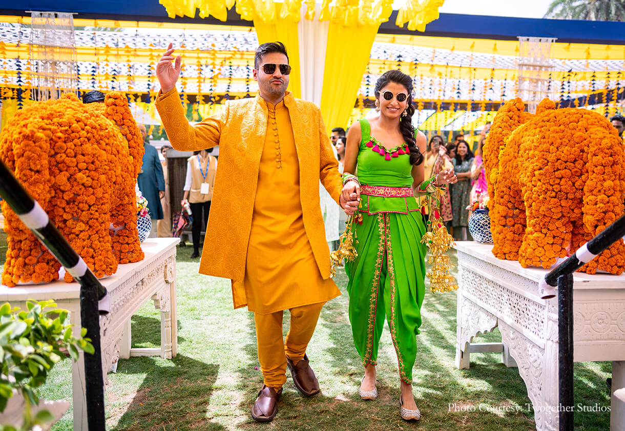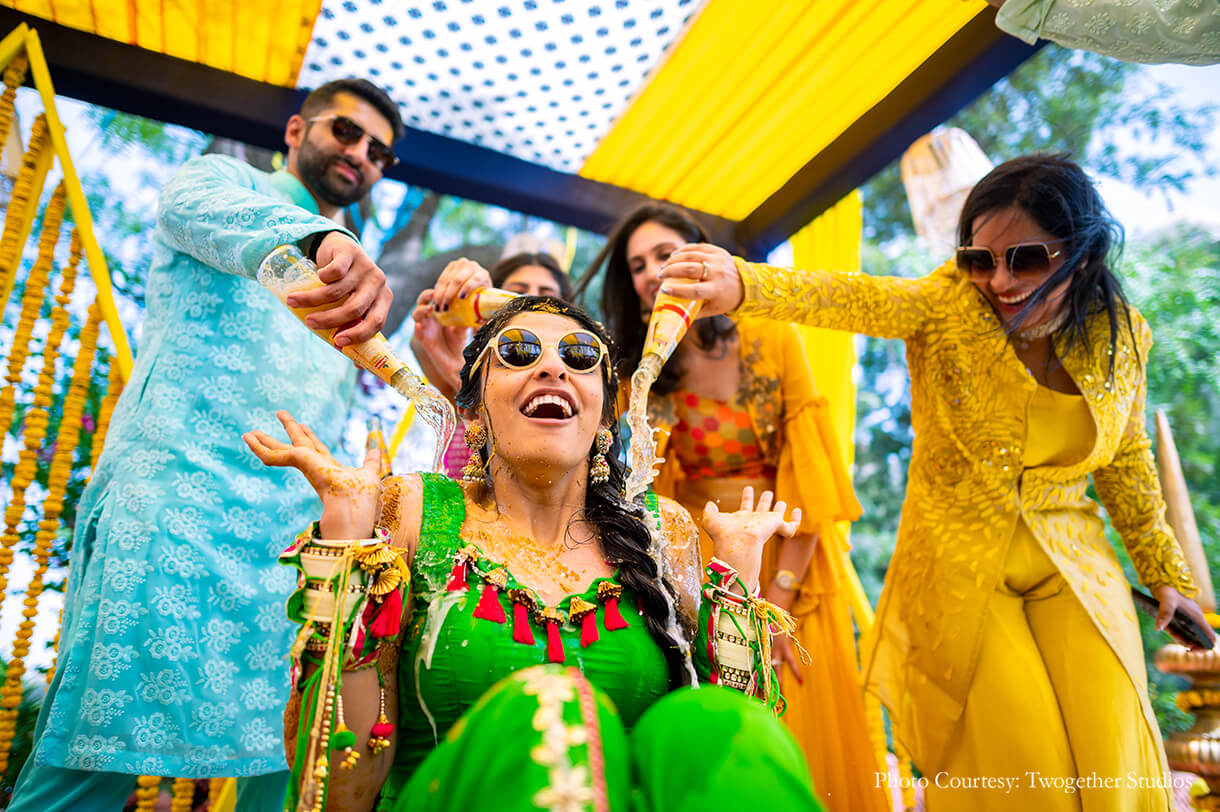 Giving the conventional yellow-hued haldi celebration a quirky twist with shades of teal blue, this couple’s haldi was thoroughly desi.