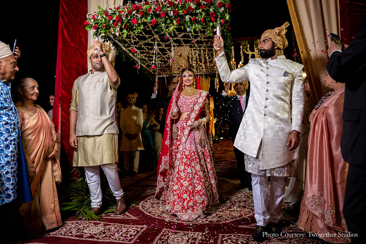 Pradeep Jaiswani from The Stage Craft shares, “For the wedding, we designed a theme that fit right in with the beauty of the venue. Royal elements, like, a heavily embellished carpet, vintage chandeliers, red and white blooms along with diyas were included to create a regal atmosphere.”
