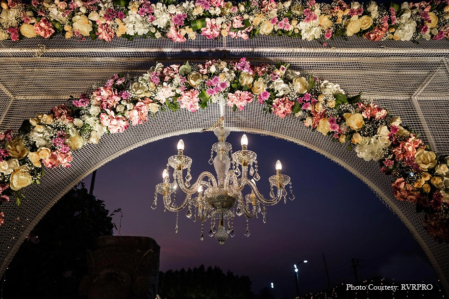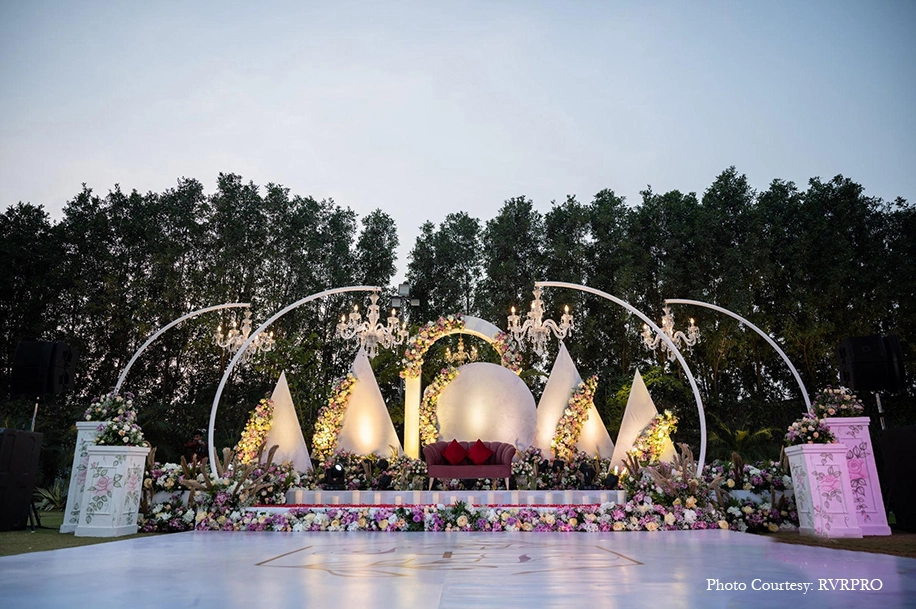 After the traditional events, the couple decided to add a dash of indo-western freshness to the festivities with a stylish sangeet. Hosted on the lush lawns, the Sangeet was tastefully decorated with LED candles, white blooms and foliage where the couple danced to their heart’s content with all their loved ones in tow.