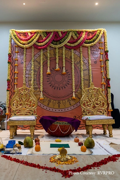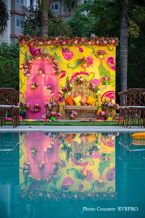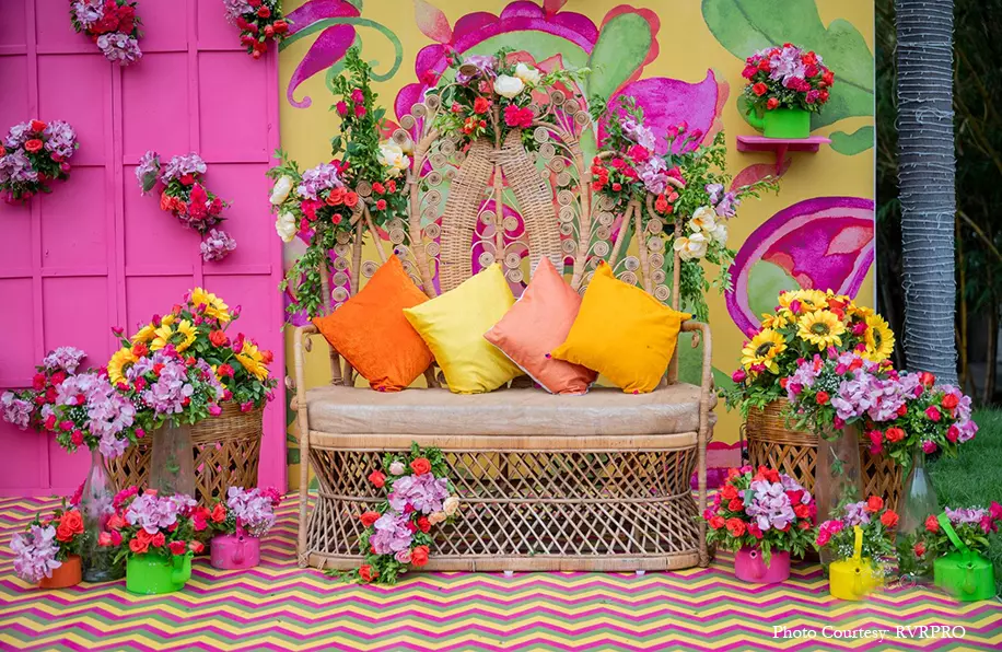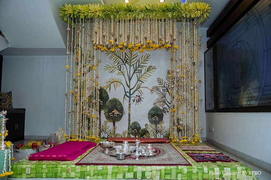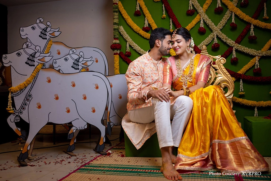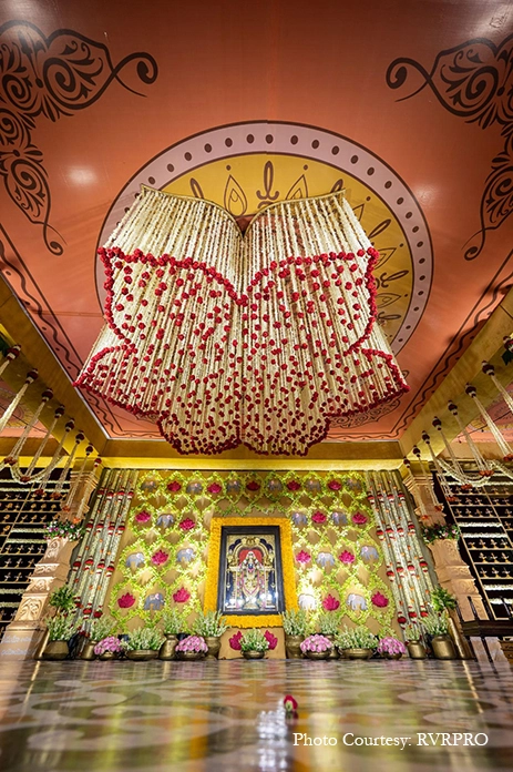 An extremely important event in Telugu weddings, the Pellikuthuru is an auspicious occasion where family and friends apply turmeric paste on the bride and groom. For this function, the couple and their families chose a simple decor theme with bright yellow marigolds. Additionally, a gilded sofa backed by cut-out illustrations of Pichwai cows made for a stunning seating area for the bride.