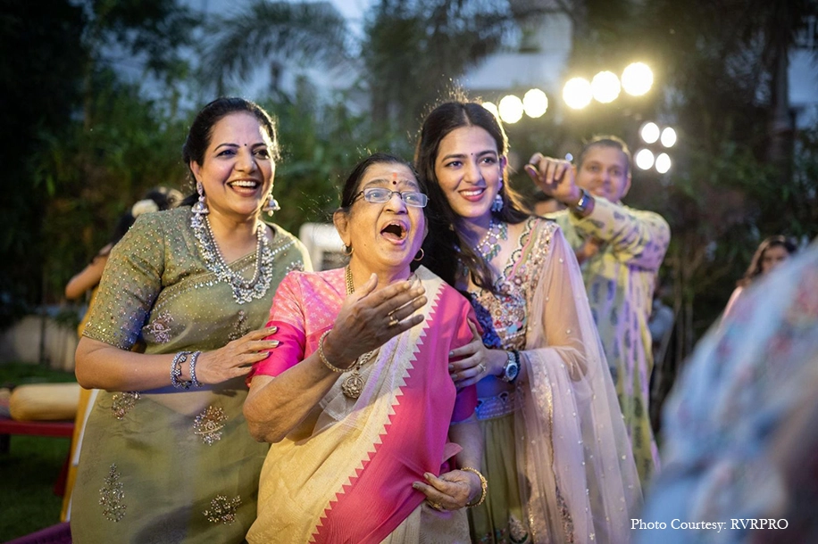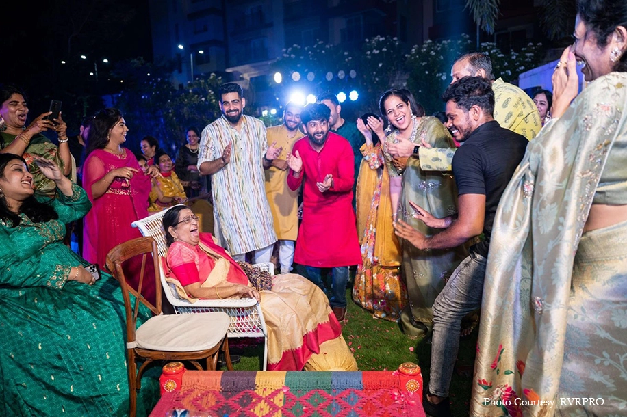 For the Mehndi, revelry took centerstage with loved ones dancing to music in surrounding vibrant blooms. Adding to the enchantment was the bride’s grandmother, the legendary P. Susheela who entranced the onlookers with her voice. Shubhashree also showed off her musical prowess as she expertly played the guitar and serenaded Vinay onstage.
