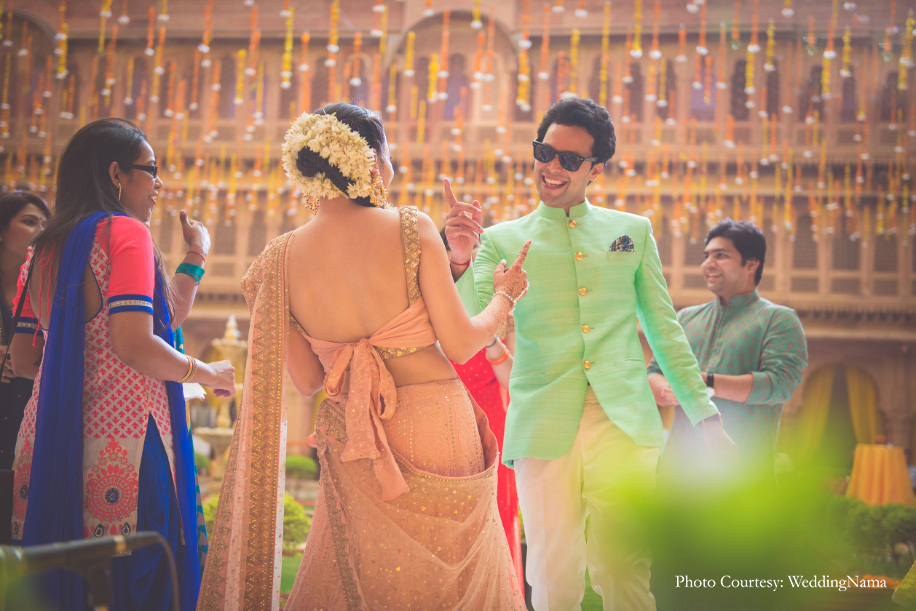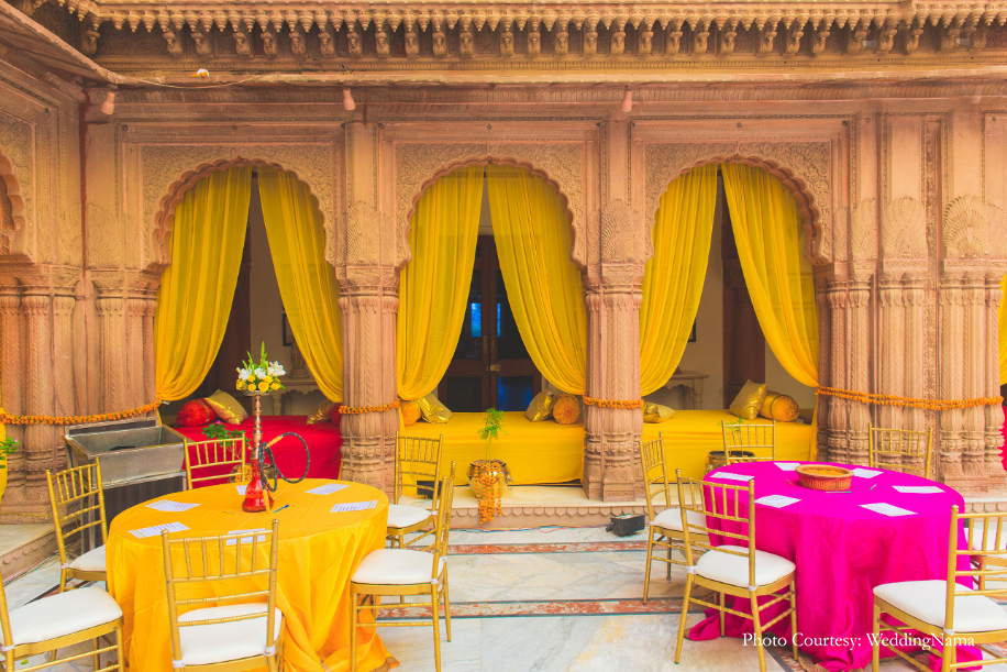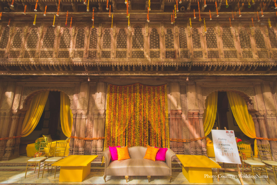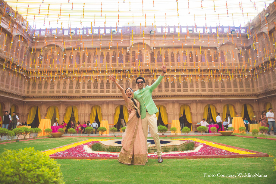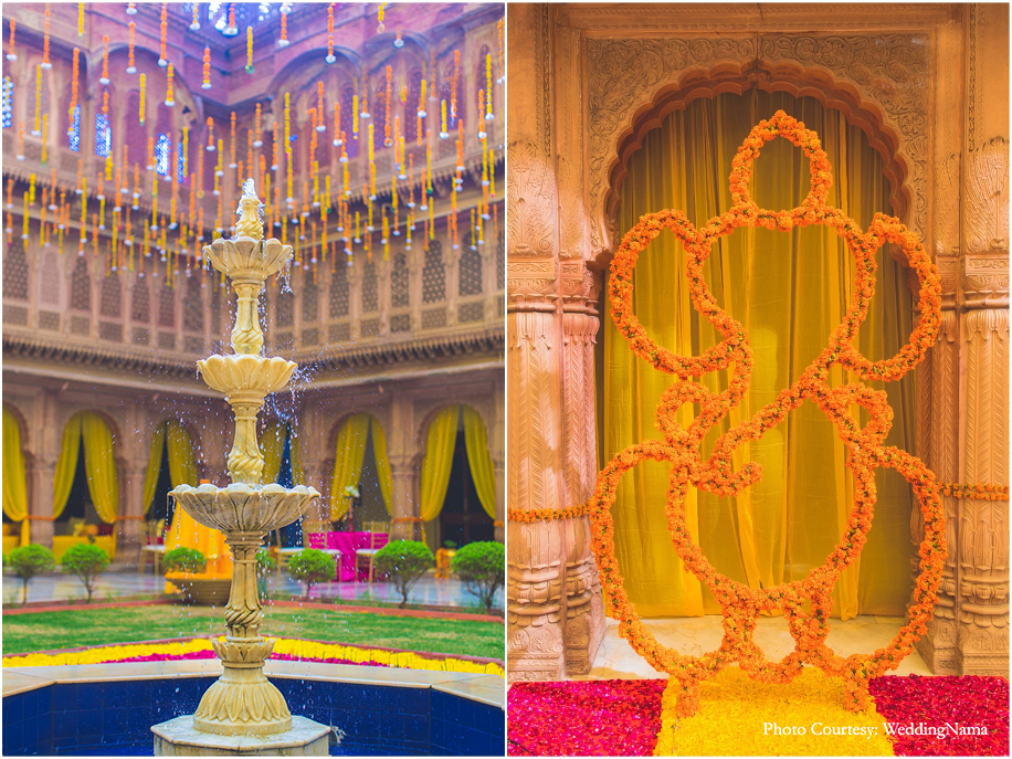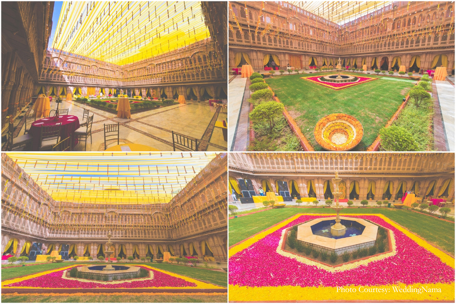 The duo’s mehndi took place in the courtyard of The Laxmi Niwas Palace, Bikaner where yellow and gold accents set a festive mood. Fabric in these colors created a ceiling and fresh marigolds added a traditional flavor to the decor. Local folk artists added to the cheer with their kachchhi ghodi, ghoomar, and matki dance performances. The sparkling fountain in the center of the space filled the atmosphere with pleasing sounds and added to the aesthetic appeal.
