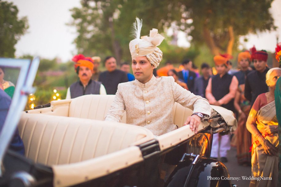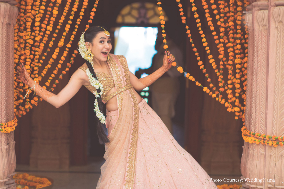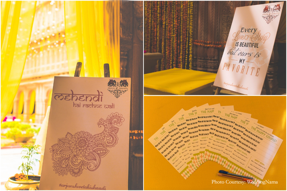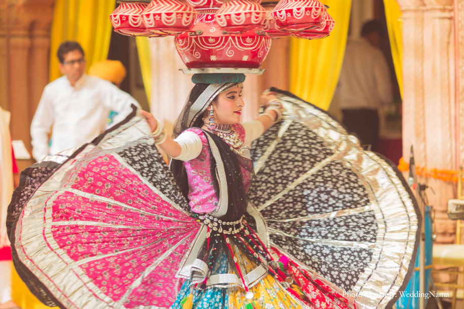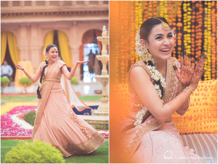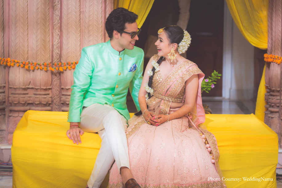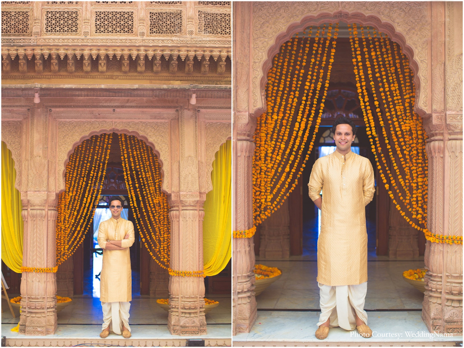 The duo’s mehndi took place in the courtyard of The Laxmi Niwas Palace, Bikaner where yellow and gold accents set a festive mood. Fabric in these colors created a ceiling and fresh marigolds added a traditional flavor to the decor. Local folk artists added to the cheer with their kachchhi ghodi, ghoomar, and matki dance performances. The sparkling fountain in the center of the space filled the atmosphere with pleasing sounds and added to the aesthetic appeal.