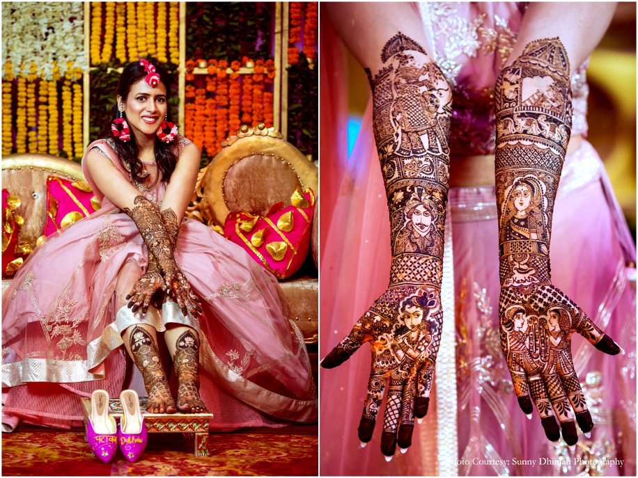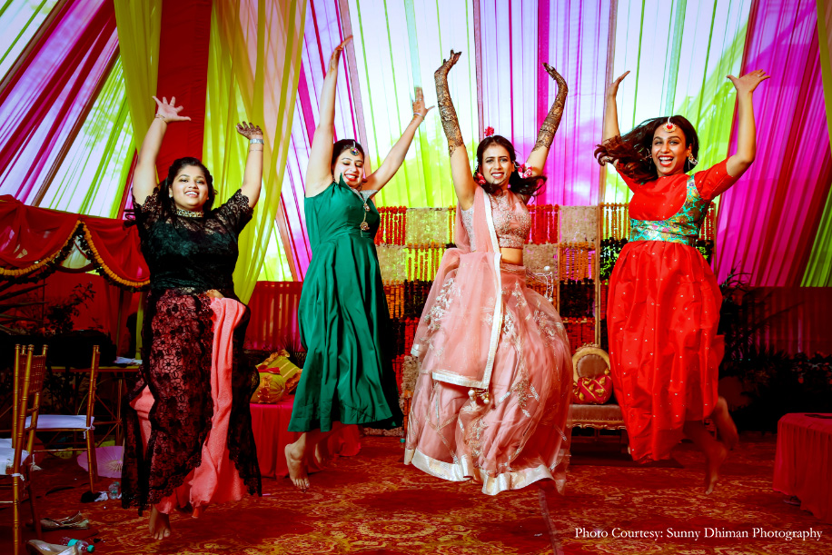 Ram Kumar from Delhi was the mehndi artist for this function. The mehndi function was at their home and was a close-knit family affair with a few friends. The decor was fresh and apt for the day function.The decor palette for these two functions included bright colors such as yellow, purple and pink. Fresh floral arrangements and pretty drapes added a carnival-like vibe to the decor. They also had family performances at this event. Shweta shares, “It was a night filled with music and fun! There were various performances by my cousins and friends but my favorite would be the performance that my parents did for me.” Shweta looked resplendent in her bright ensemble and beautiful floral jewellery.