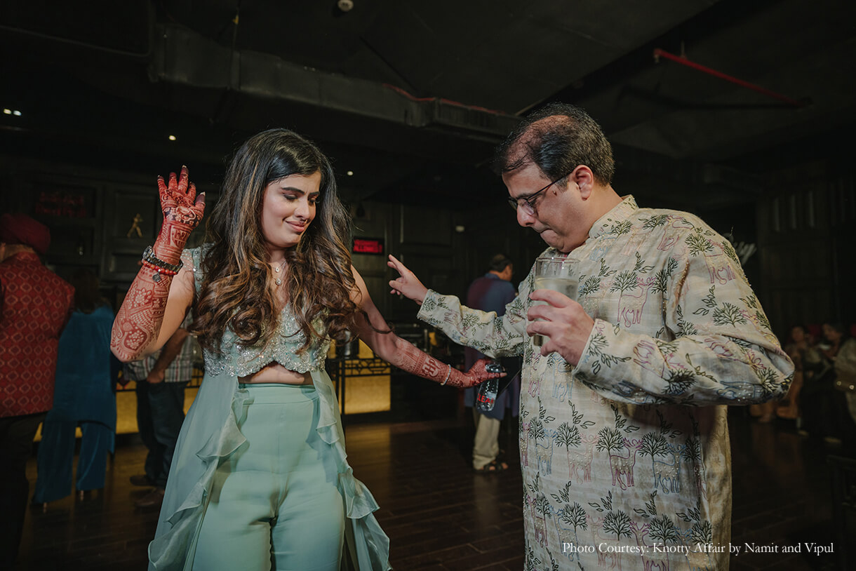 The couple hosted a lively lunch at The Lalit Mumbai to welcome their guests. Music and merriment reigned supreme as families from both sides met and mingled in a casual, laidback setting, accompanied by some delicious fare. The bride kept it chic with a mint co-ord set, while the groom wore a simple beige kurta.