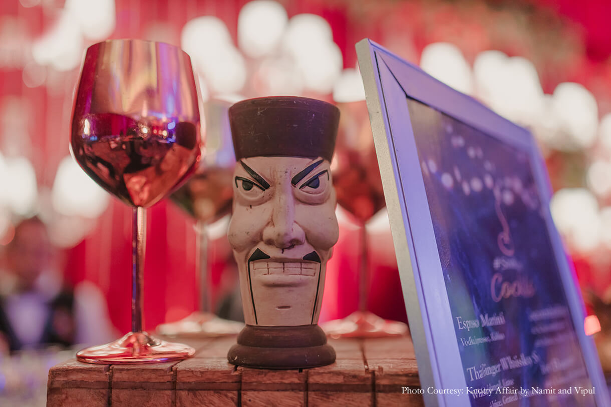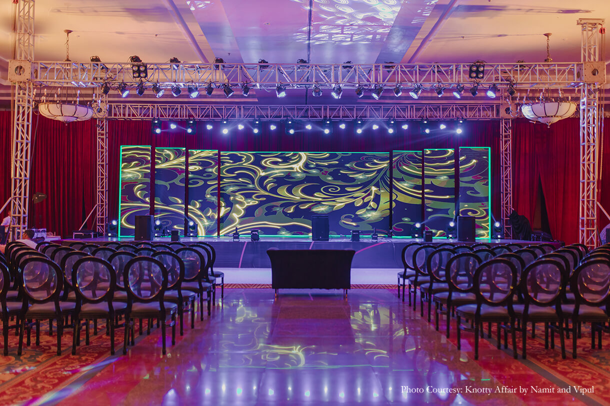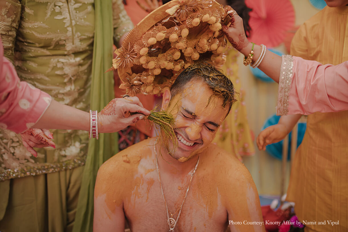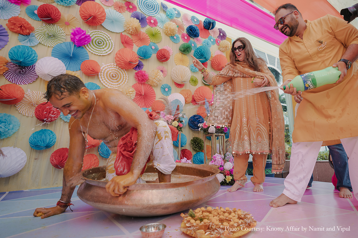 If traditional marigolds are too passe for you, take a cue from Akhil’s colorful Haldi soiree. Brightly hued drapes and flowers lit up the occasion with their energy, while a wall of origami paper art made for a vibrant and creative backdrop to the ceremony. Sporting a red kurta, Akhil was doused in turmeric and showered with love and blessings by his friends and family.