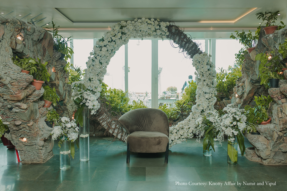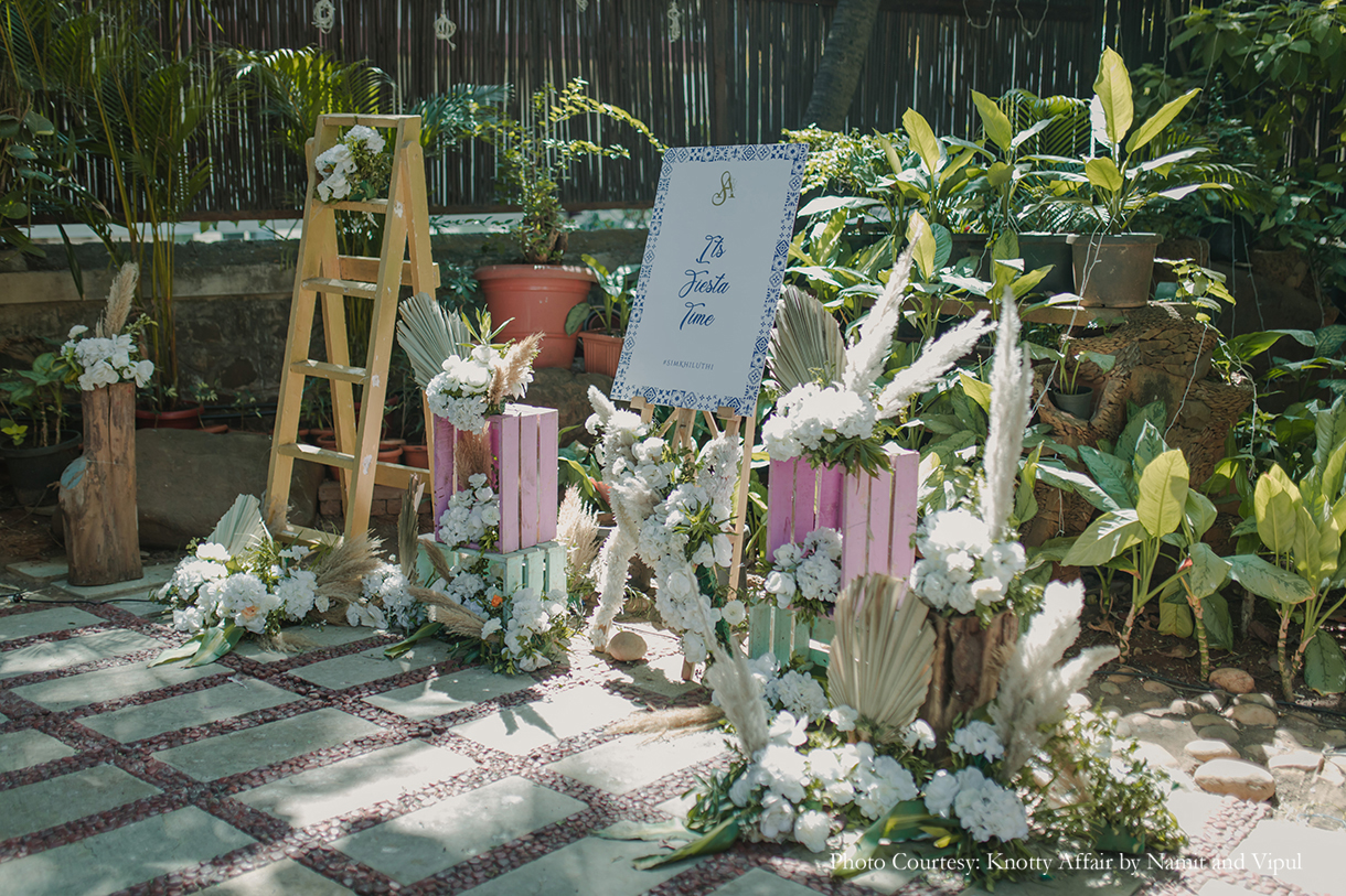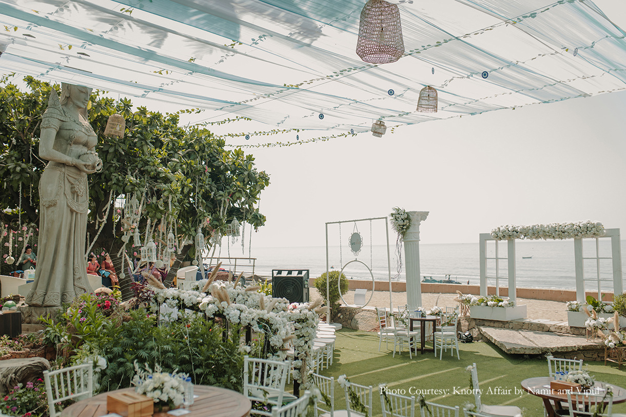 Hosted at the beautiful sea-facing venue of Kino Cottage, the Mehndi soiree was a whimsical affair full of beautiful floral decor with arches, lush foliage, and lanterns. Pampas grass, painted crates, etc added a bohemian flare to the occasion, while elements like monogrammed coasters added a personal touch. The bride and groom sported soft pastel tones to match the romantic mood of the function.