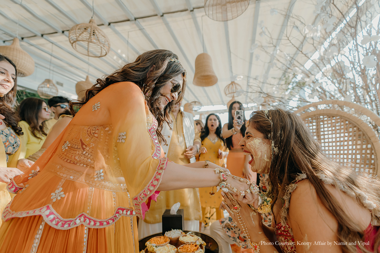 Their Haldi ceremony was an exuberant, boho-inspired celebration under a sunlit canopy. Wicker elements, dried branches, and yellow marigolds brought an organic charm to the space. Guests dressed in mustard and ochre hues added to the festive palette.