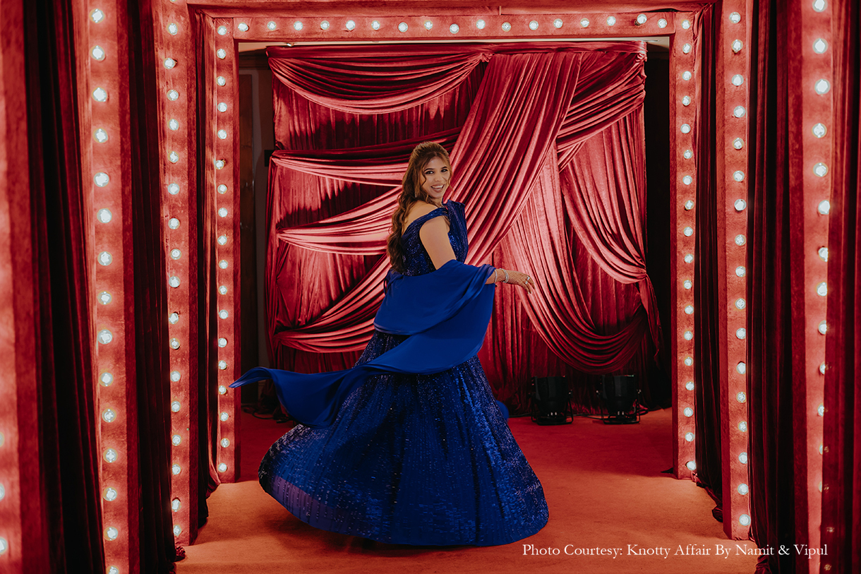 An unapologetically glamorous evening, the sangeet was a blend of Bollywood grandeur and Broadway drama. A stage draped in lush red velvet set the tone, while shimmering lights added an old-world theatrical charm. Simran dazzled in a sparkling blue gown as the couple lit up the stage with their performance. The evening transitioned into high-energy celebrations, with friends and family raising toasts at a quirky ‘Shots Box Office’ bar—a nod to their love for cinema and celebration.