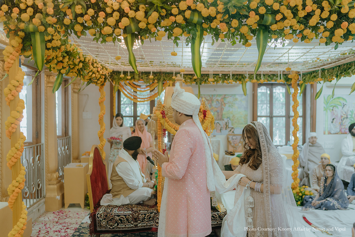Bride’s Outfits: Tarun Tahiliani (Anand Karaj), Netri Agarwal (Haldi), Arpita Mehta (Mehendi), Sabyasachi Mukherjee (Wedding), Gaurav Gupta (Sangeet)