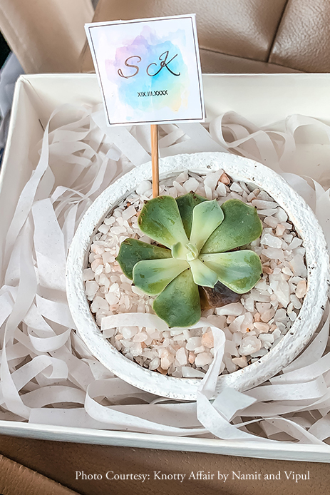 “We wanted every bit of the wedding to be really special and memorable. We started off with the simple thought of sending invites with a plant and our logo, which was conceptualized by Good Vibes. Photographs being one of the most important things for us, we researched long and hard to find the perfect team, and we finally picked Knotty Affair by Namit and Vipul. They worked with the utmost patience and were outstanding in the way they handled the whole process.”