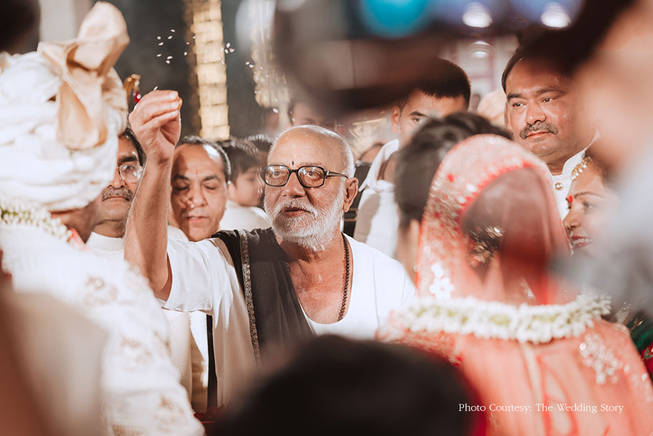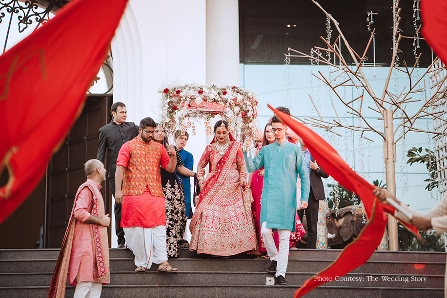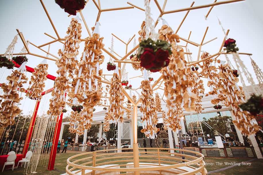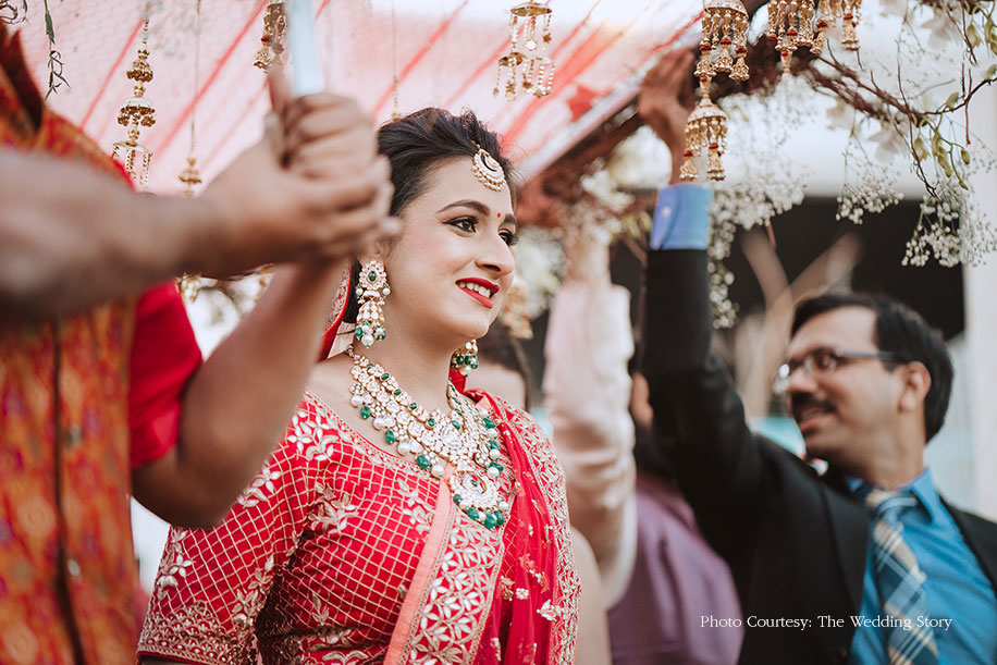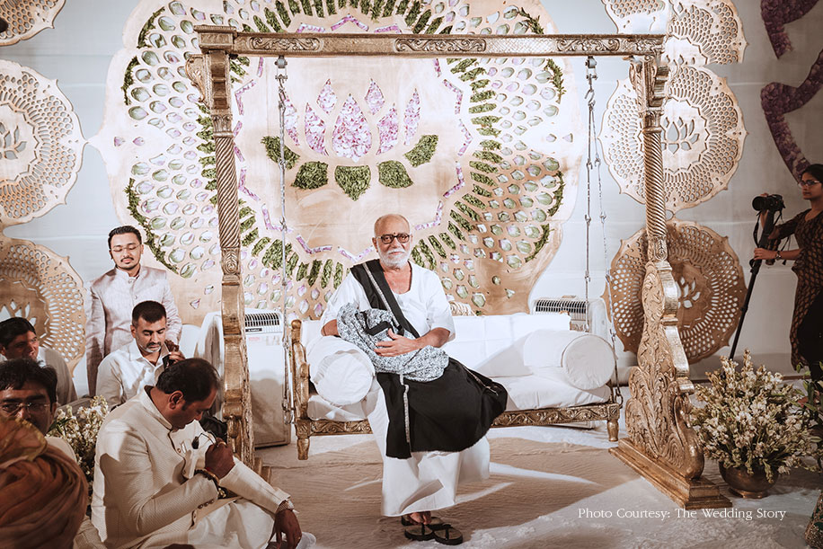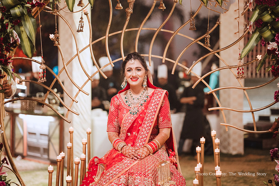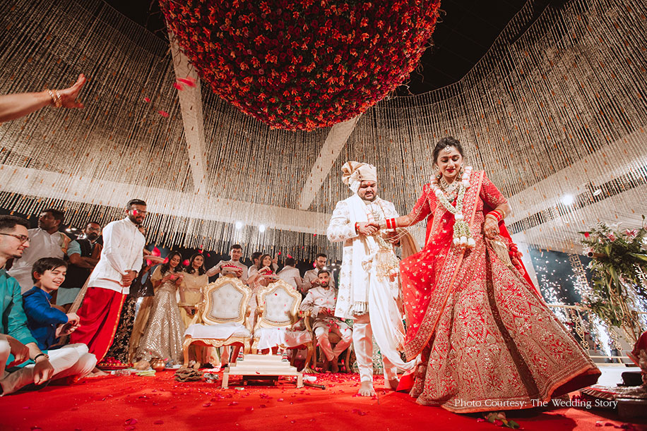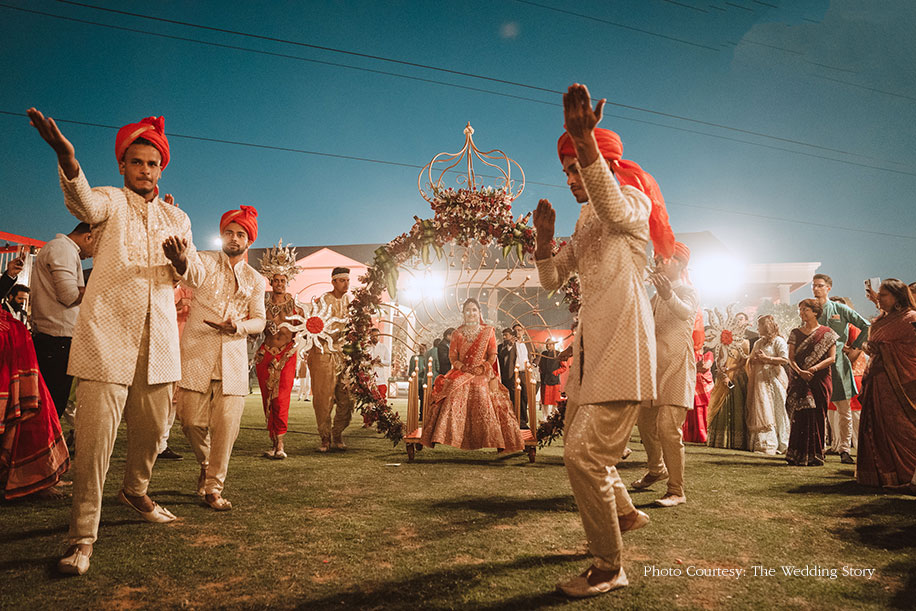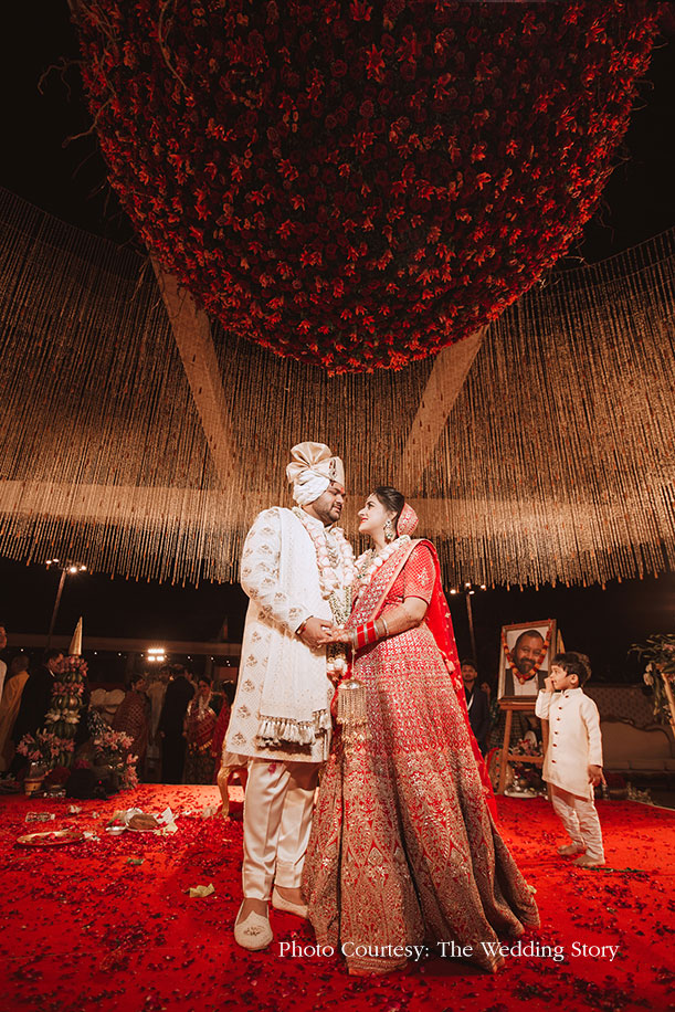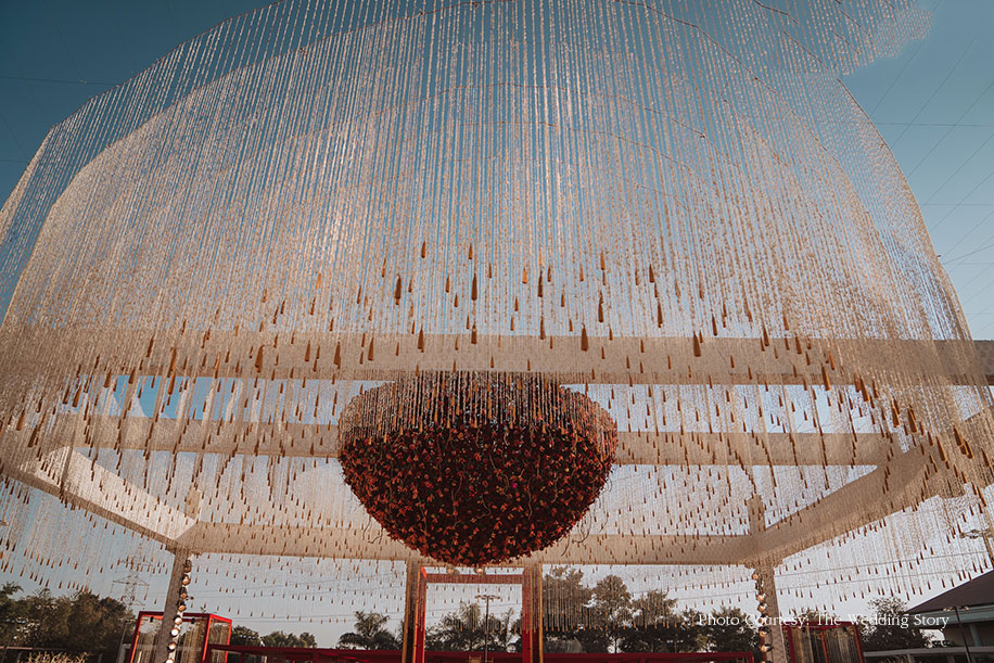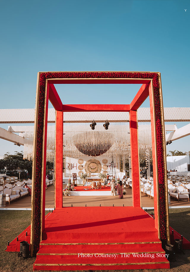 Designed by Abhishek Arora, the wedding blended traditional inspirations with grandeur for a truly royal charm. A grand chandelier of Rajanigandha flowers added a fresh and auspicious feel, while the red and gold color palette along with the intricate Gate and Walkway with temple-themed decorative pillars looked ethereal. A huge Gazebo was created for an exquisite dining experience with shamdaans and floral arrangements decked with rich burgundy velvet drapes and overlays. A special Jaimala stage was created with the sitting area of Morari Bapu with a Ram backdrop and jhula. The groom made a unique Baraat entry with his sisters on a customized tractor, while the bride’s entry on a chariot accompanied by traditional dancers and incense was no less than that of a princess.