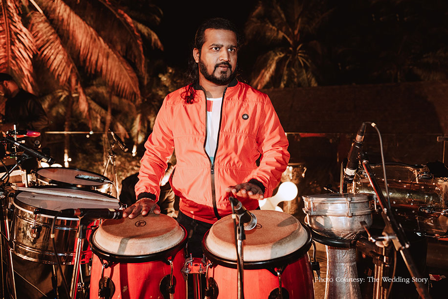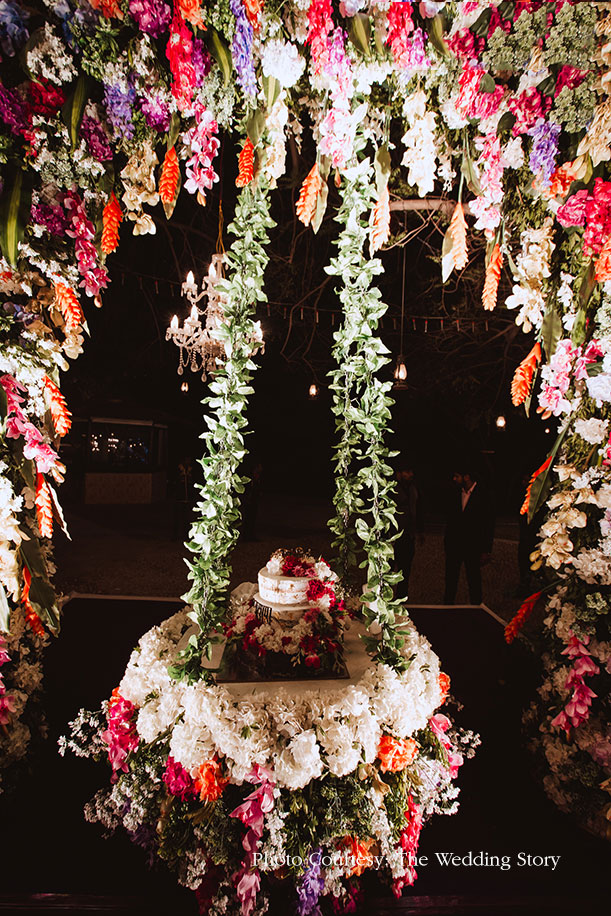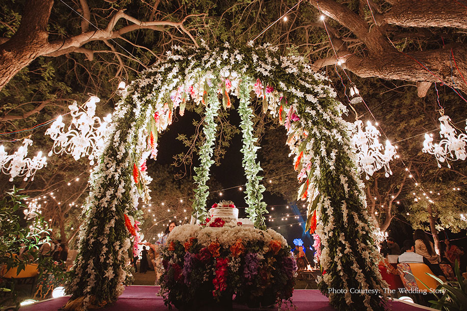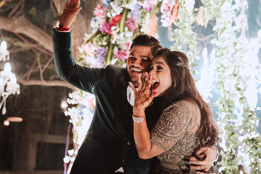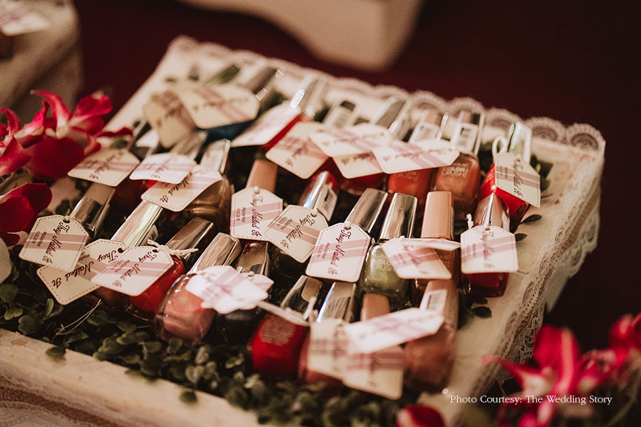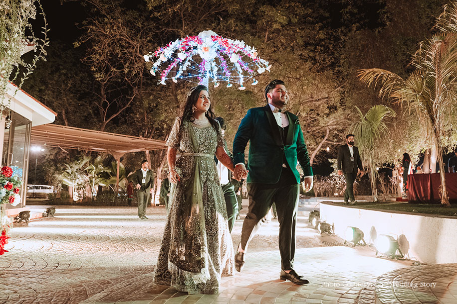 The Vadodara festivities kicked off with a colorful Mehndi function. An abundance of blooms, a swinging boomerang station and a quirky couple entry with a floral umbrella under the starry night made the event memorable. The guests were presented with unique wedding favors such as customized hair brushes with a hashtag, Nail Paints and Sanitizer.