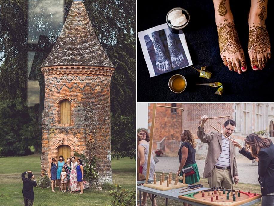 The Mehndi ceremony was held on a Friday evening and was intended to be an icebreaker for guests and loved ones. “We did not wear anything extraordinary for this event on purpose to make sure our guests also feel casual and carefree. The ladies enjoyed getting henna applied on their hands and feet in a variety of colors and designs, while the other guests enjoyed some outdoor games and French liquor tasting,” recalls Olivier.