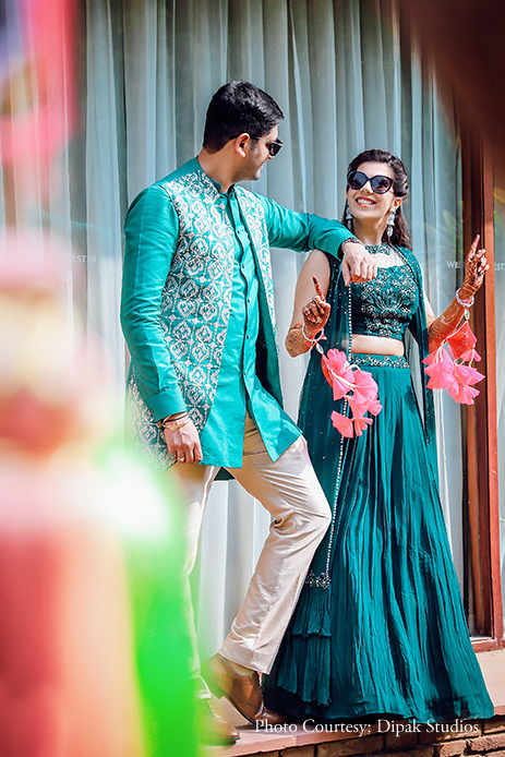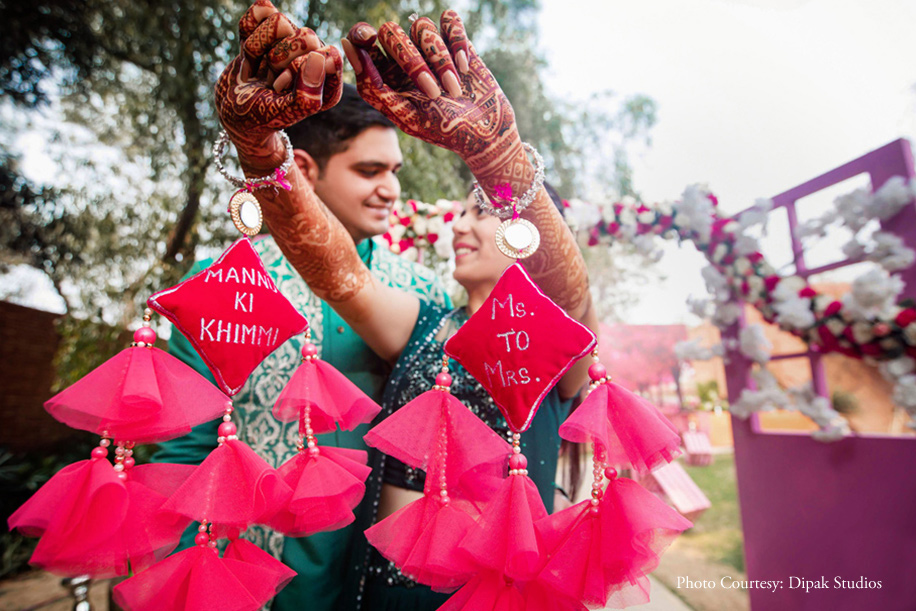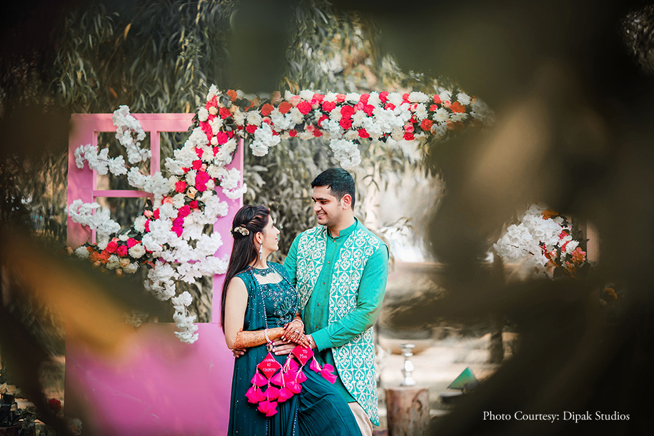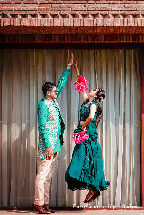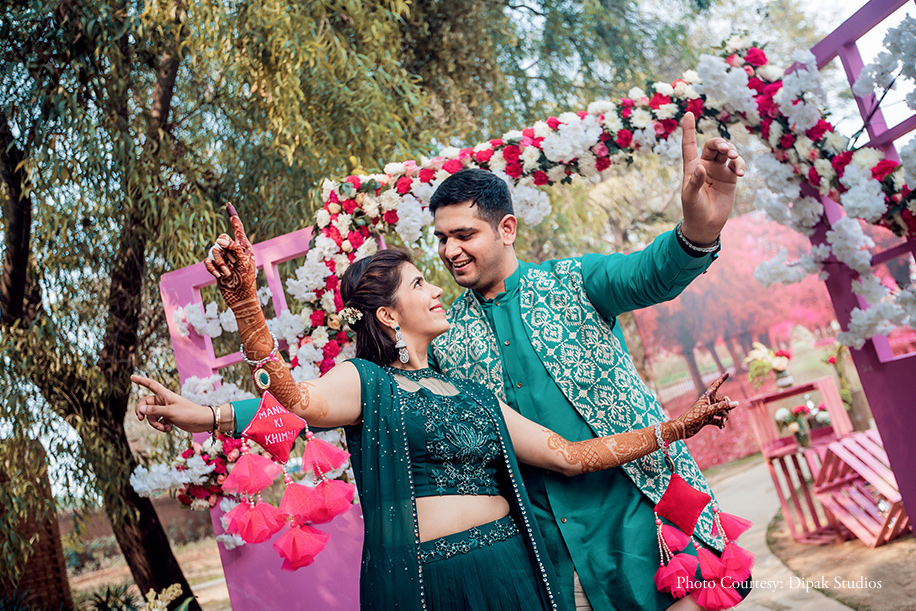The outdoor mehndi decor exuded bohemian charm with wooden racks, flowers, and foliage. A statement foliage arch made for a lovely photo opportunity spot for the guests. The evening function hosted indoors in the ballroom saw soft pink decor, following the day function seamlessly. The couple looked cheerful in matching teal outfits.