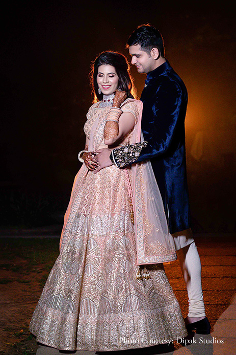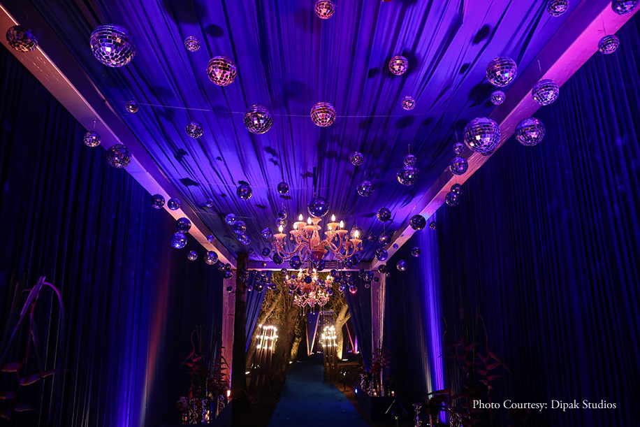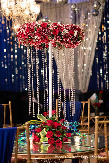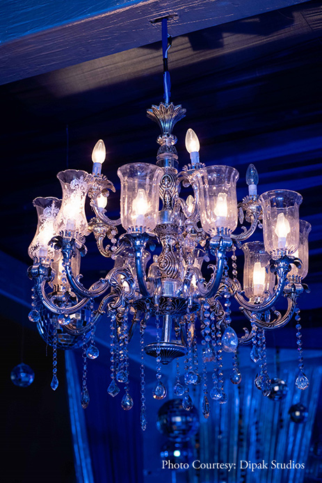 The tasteful sangeet and ring ceremony saw glamorous decor of midnight blue and gold elements with endless shimmer! Mini silver disco balls, crystal chandeliers, and a whole lot of lights added to the magic, while gold centerpieces with flowers pulled the look together. The groom complimented the decor in a stylish, embellished blue sherwani while the bride sparkled in a shimmering lehenga.