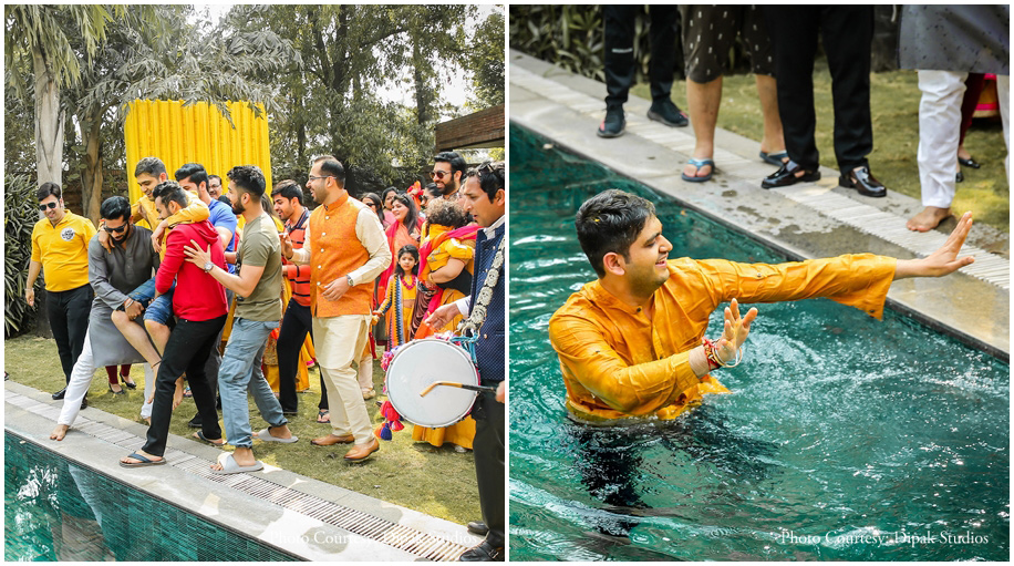 The vibrant, Rajasthani-themed Haldi celebration was brought to life with a colorful ceiling installation and multicolored tassels. A bright backdrop of marigold blooms created a sunny ambience, while bells and other props lent an authentic traditional vibe. What stole the show however was the exotic floral bridal swing. Hosted by the poolside, the carnival-like atmosphere of the event was full of fun splashes and funky colors. After being smeared with haldi paste, the groom was pushed into the pool, which made for a memorable moment.