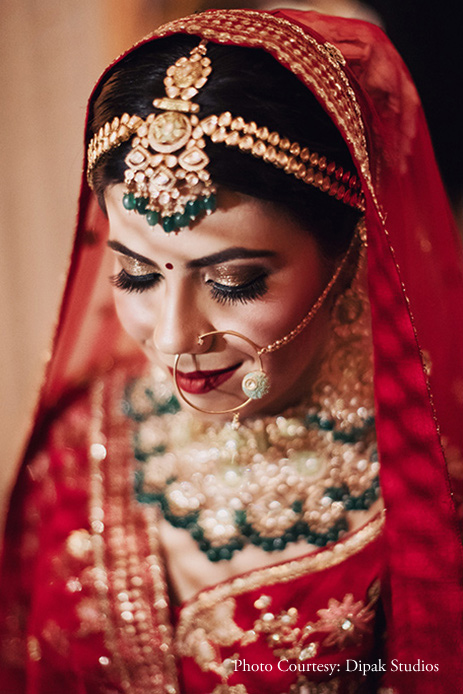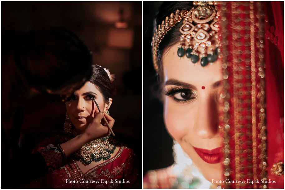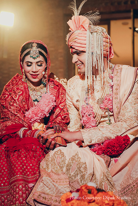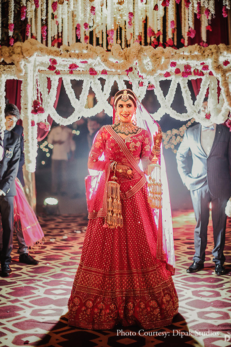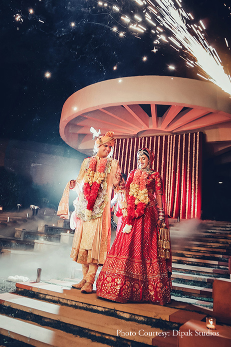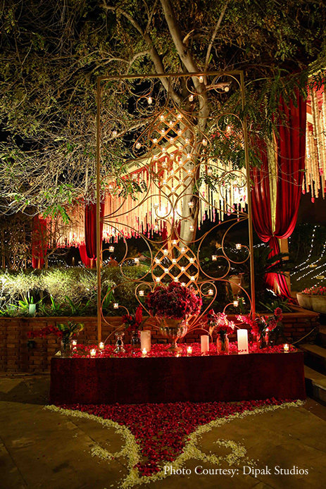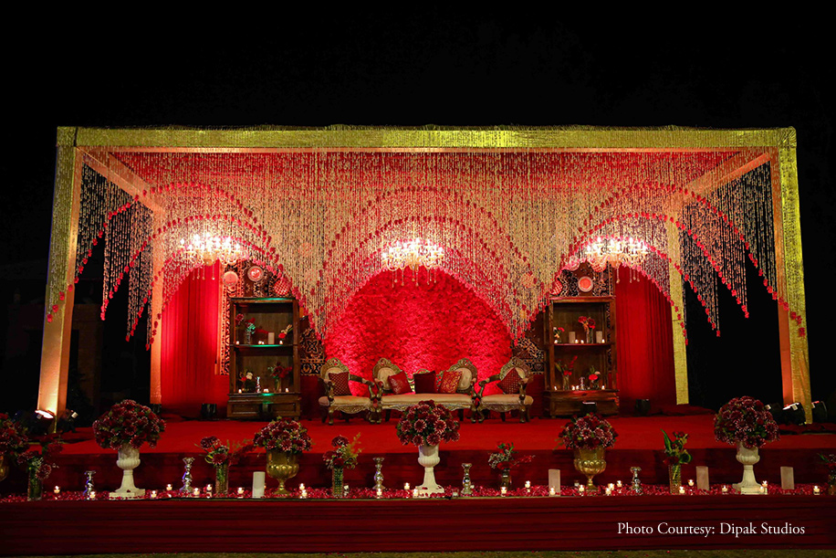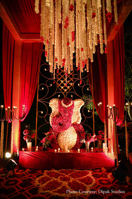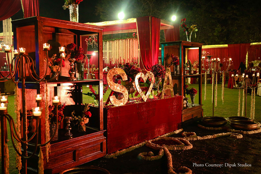 The wedding festivities exuded royalty with magnificent white and red decor elements. A canopy of rajnigandha and rose blooms spanned the entrance and the stage, while more flower arrangements dotted the entire venue. Vintage shelves and other memorabilia added to the regal retro feel of the night. The highlight however was the statement floral idol of Lord Ganesha at the end of a path lit with candelabras. The groom looked like a prince in an elaborate ivory sherwani with pearl jewellery. Dressed in a quintessential bridal red ensemble, the bride left everyone emotional with her heartwarming entry with her parents whose hands she held as she walked towards her new life.