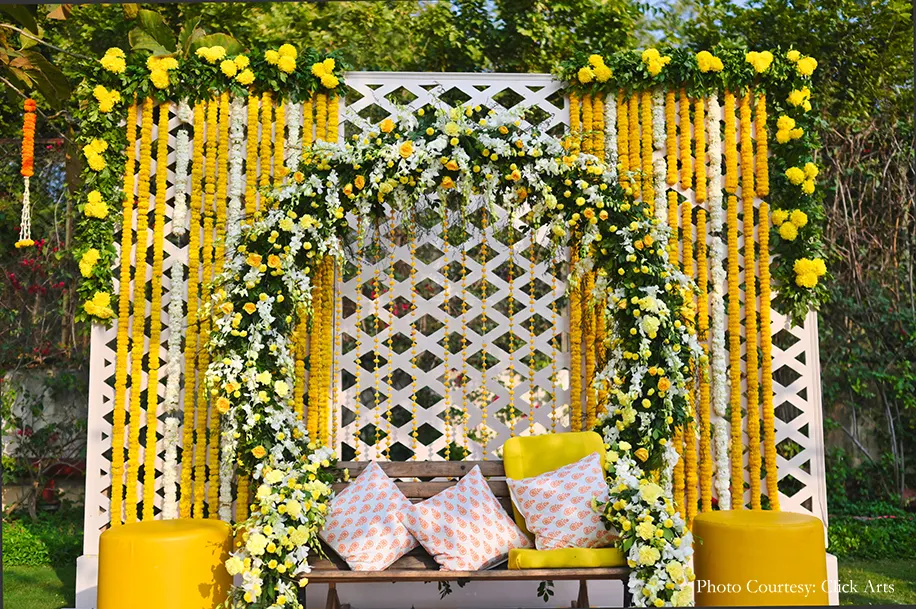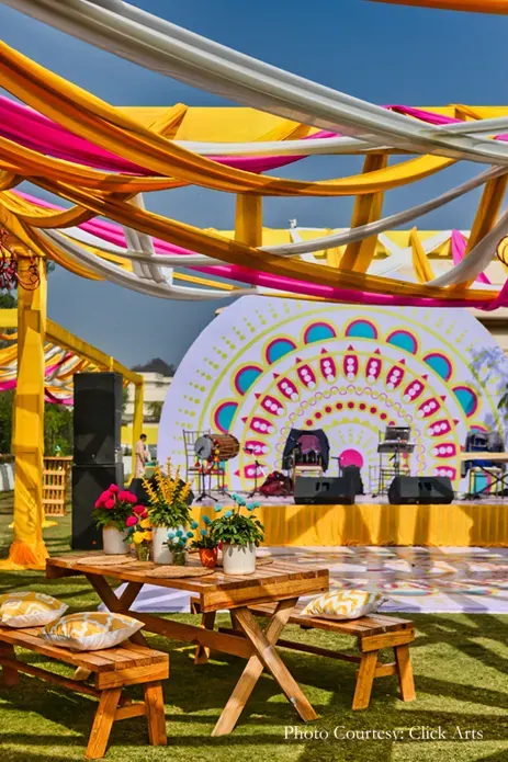 Vivid and seamlessly combining traditional as well as contemporary elements, the Haldi decor boasted of peppy yellow hues that were perfectly in sync with the sunny environs. Consisting of white and yellow floral arches, a stage flanked by ethnic motifs, wooden furniture and a huge dance floor, this function put everyone in a boisterous mood as they slathered the to-be-weds with turmeric!