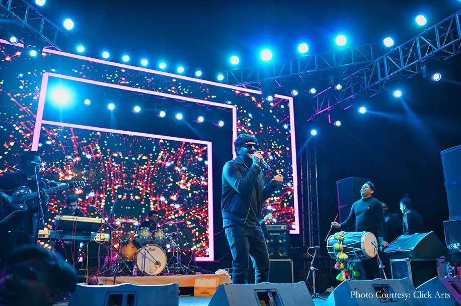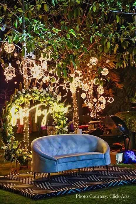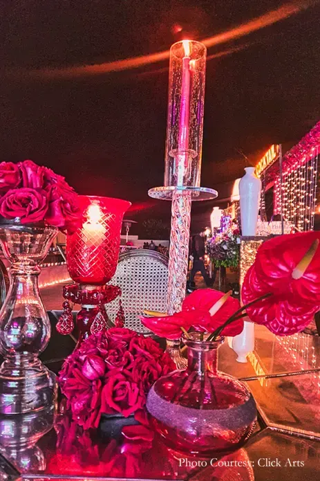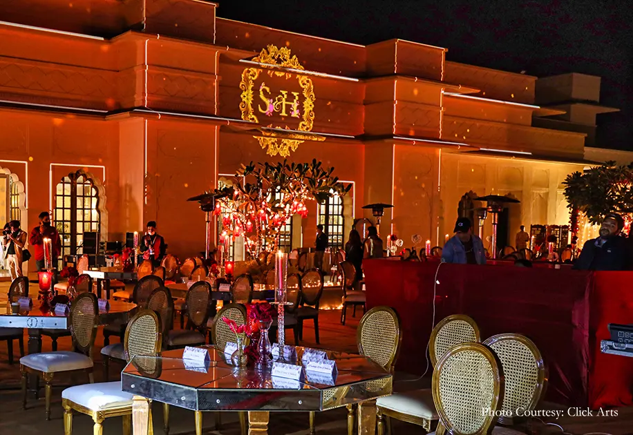 Emanating oodles of glamor, the Sangeet night witnessed everyone shaking a leg under warm golden lights. To ensure that everyone’s spirits were high as they reveled, the colossal stage was occupied by a live band that belted out enchanting tunes. Post that, the guests proceeded to enjoy their meals while seated on a long table decorated by dainty flowers, under a starry sky accentuated by a canopy of twinkling lights.