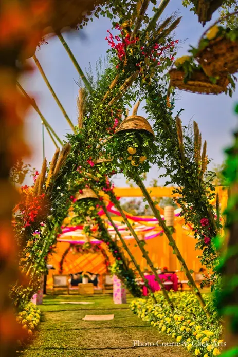With an entrance constructed of multiple bamboo canopies adorned with blooms and pampas grass, the mehndi function brimmed with color. Equipped with a colorful dancefloor under the blazing sun, a stage flanked by ethnic motifs and wooden furniture this event had everyone shaking a leg while raising their henna patterned hands up in the air!