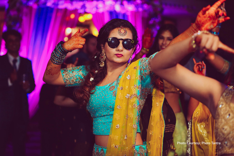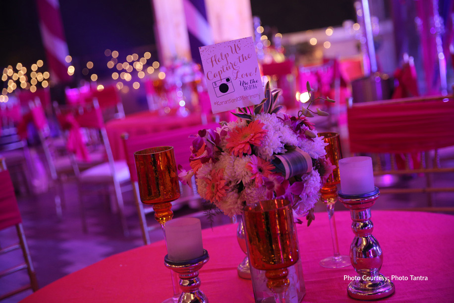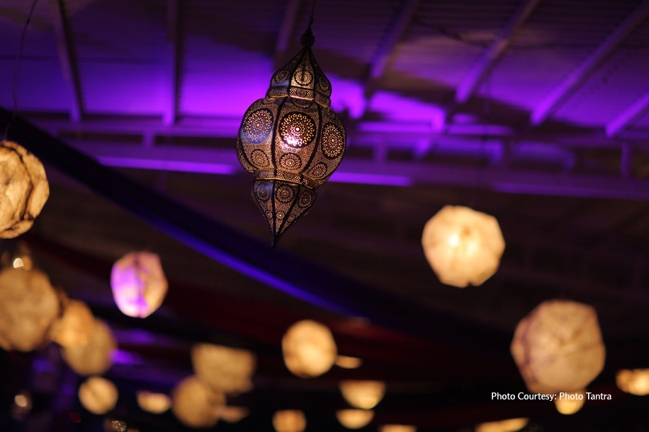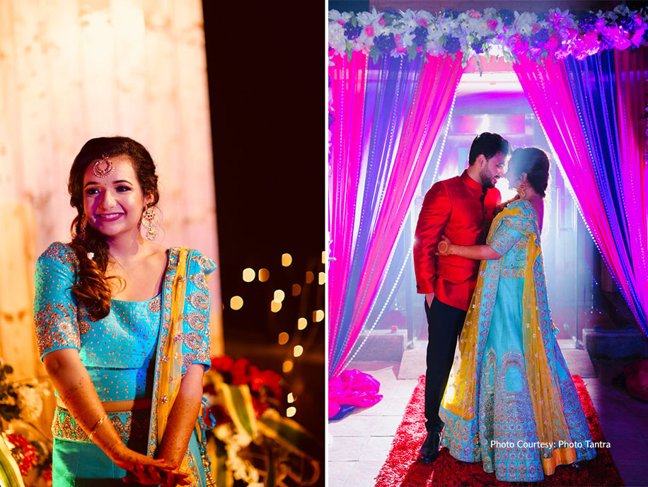 “Our sangeet had a ‘Moroccan Night’ theme, so we used colors and elements that would help us achieve an authentic vibe. We used lots of drapes in blue and pink along with Moroccan lanterns and candles. We also had purple lights and floral arrangements that helped set the mood. I wore a bright yellow and blue lehenga from CTC Plaza in Delhi for this function.”