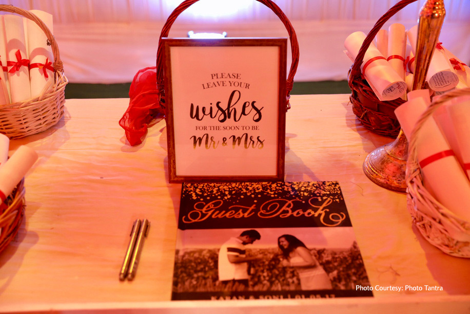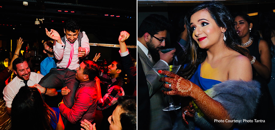 “The coolest part of our cocktail party was the signature drinks named after us. Karan’s drink was called ‘Black Karant’ while mine was called ‘Sinister Sonitini.’ We had one more drink called ‘Jab We Met.’ Some great music helped elevate our spirits further, and we handed out glow sticks to our guests so everyone could savor the rocking party experience. The Nicole Bakti gown I wore for this function was purchased in New York. Karan wore a suit from Michael Andrews in New York.”