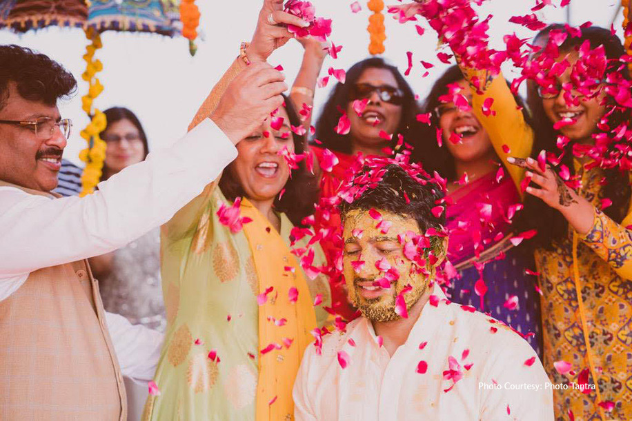 “The decor for our ‘haldi’ (turmeric application) involved lots of bright colors. While yellow and orange marigolds and matching drapes were the main part of the setup, we also added quirky umbrellas with ethnic prints to make the environs a little more vibrant.”