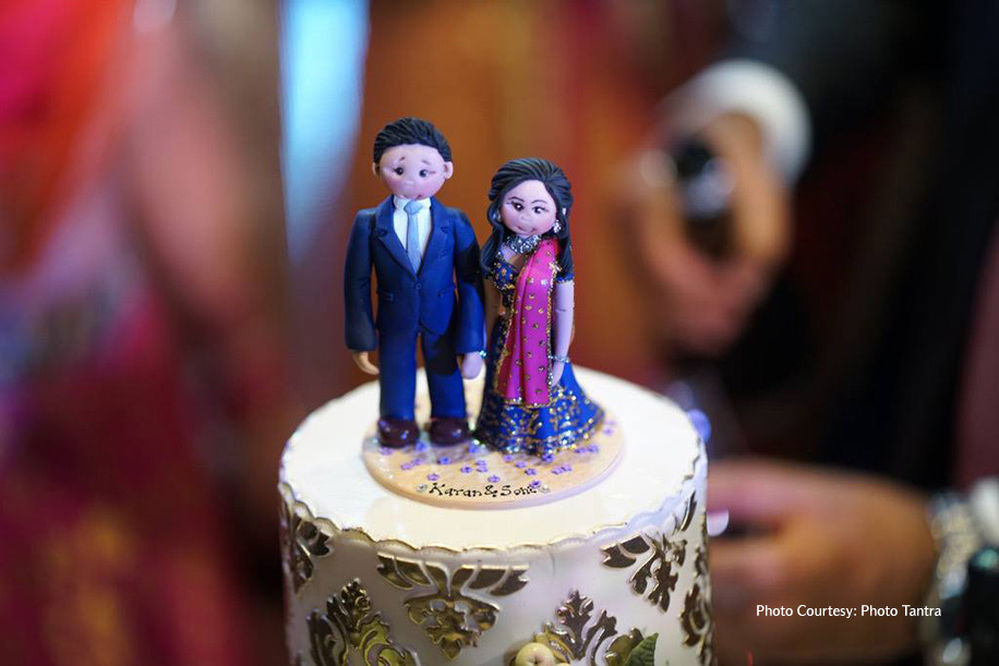 “Our wedding decor had a sophisticated vintage charm. The entire setup was done in white with a few splatters of greens and violets. The stage was particularly beautiful and attracted a lot of compliments because of the way it was curated and arranged. Our wedding cake was a contemporary creation by Firefly Bakery. I ordered a custom cake topper from Etsy. The miniatures were dressed like me and Karan which made it look more personal. We invited Silver Strings to perform at our reception. I wore a custom-made blue and pink lehenga from Paris Street in New Delhi while Karan wore a black suit from Michael Andrews in New York.”