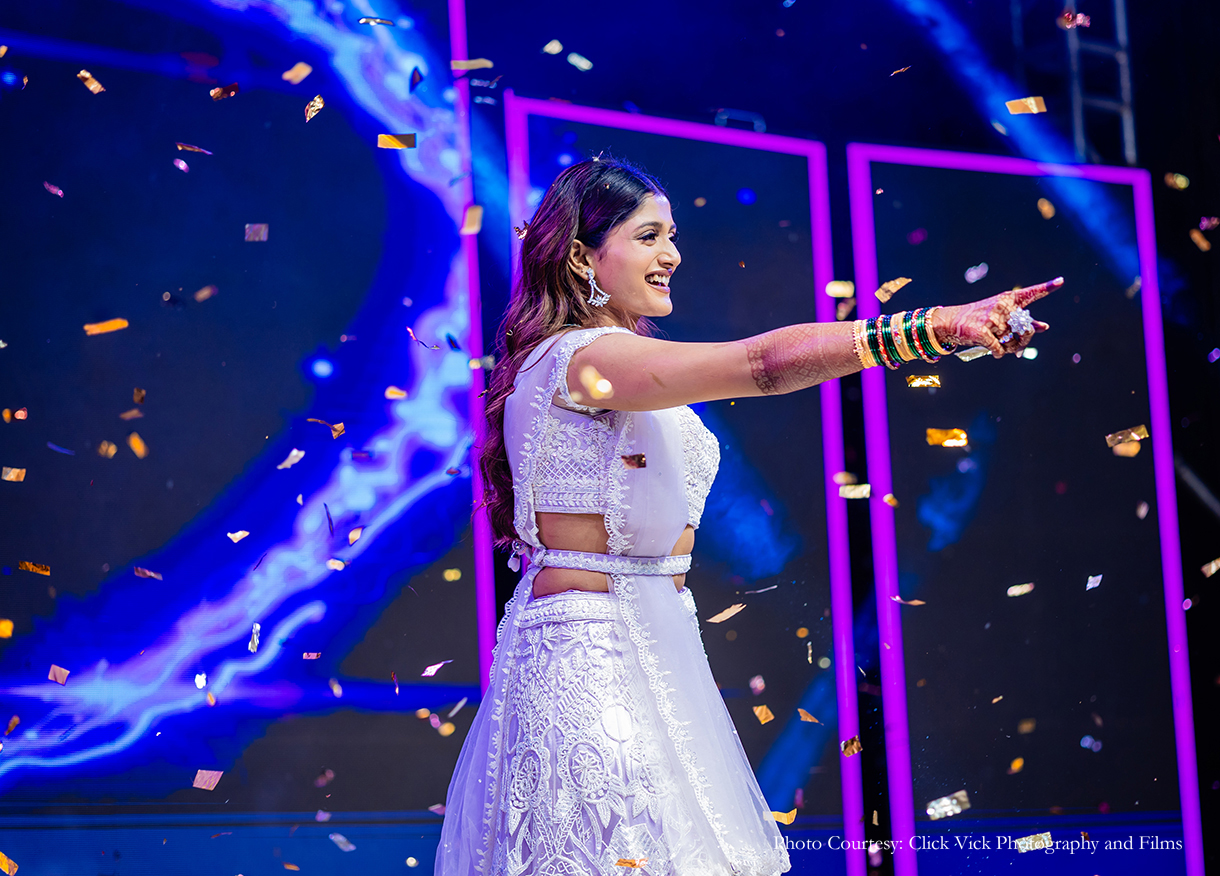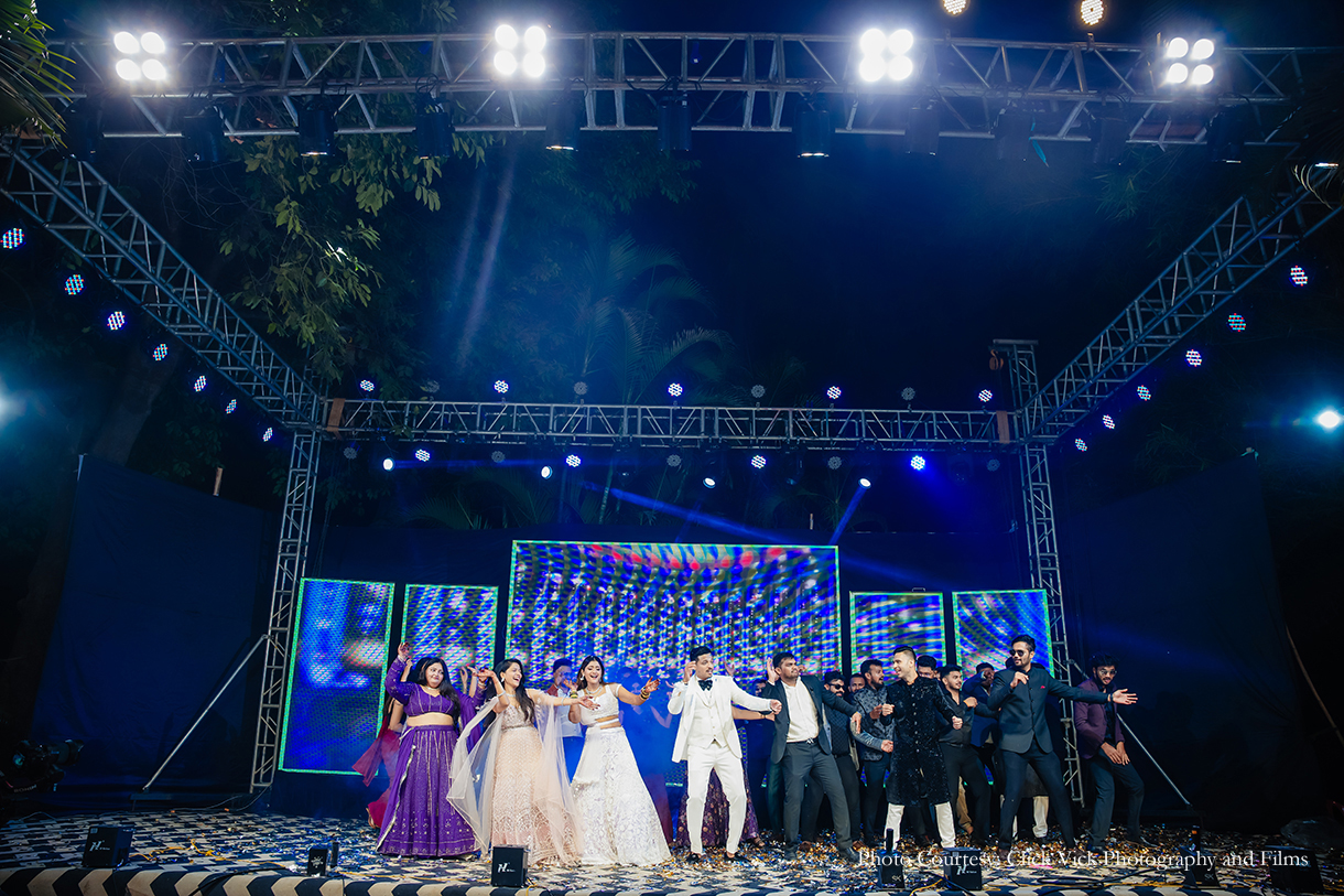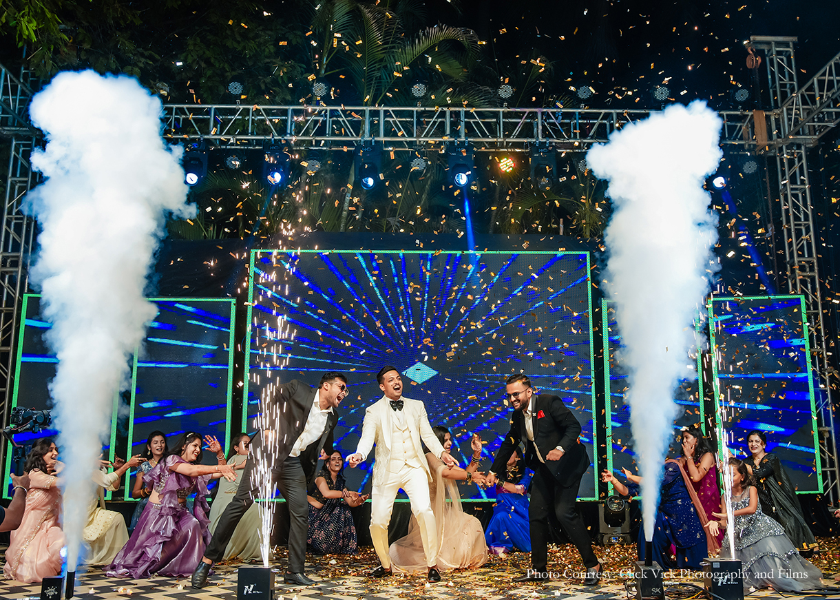 The sangeet was a glamorous occasion where everyone took turns on the stage to put their best foot forward. Hosted under the starlit sky, the colossal stage with its LED backdrop had everyone in the mood to party. Confetti blasts and group performances by family members kept the energy high till the wee hours of the night!