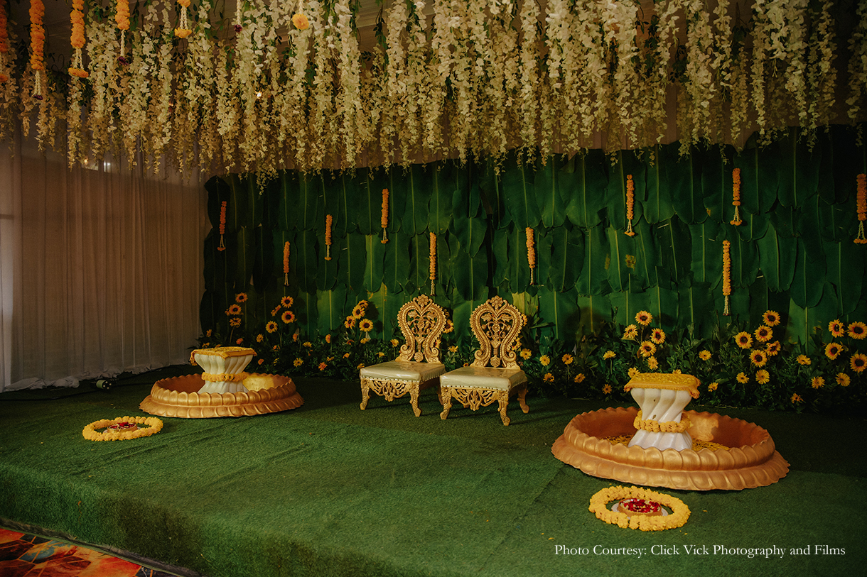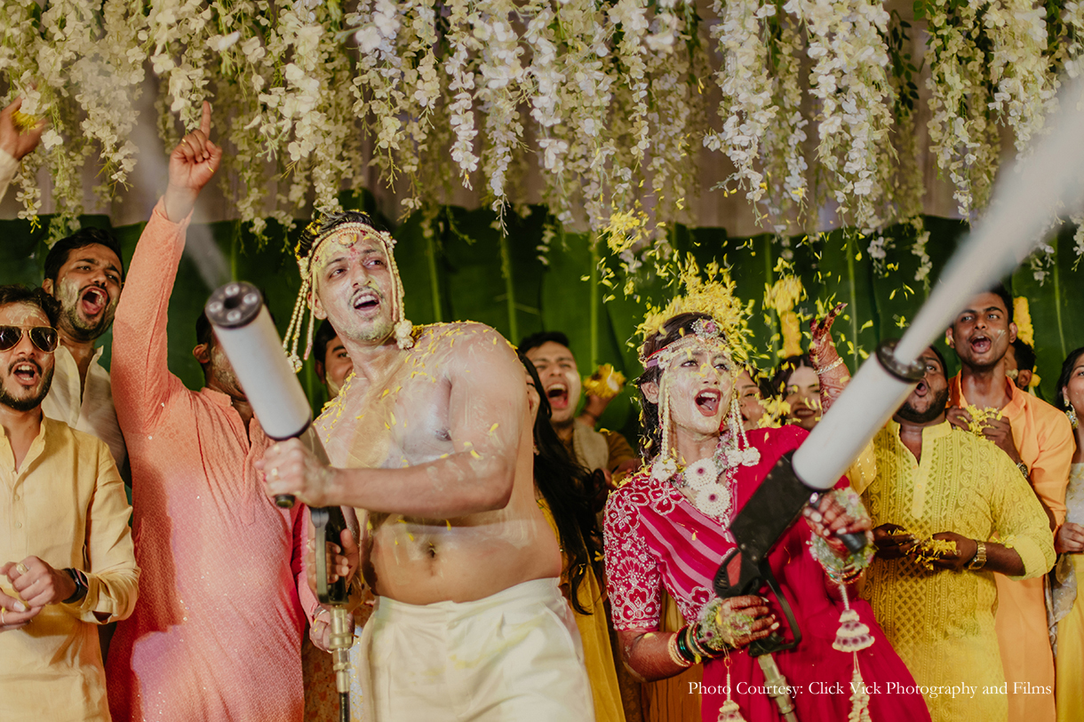 Merging traditional decor elements with contemporary ones, the haldi featured several playful moments. Seated in brass urlis, the couple was slathered in a turmeric mixture to get their wedding glow on. Meanwhile, a backdrop of lush green banana leaves and suspended white blooms made everything look picture-perfect.
