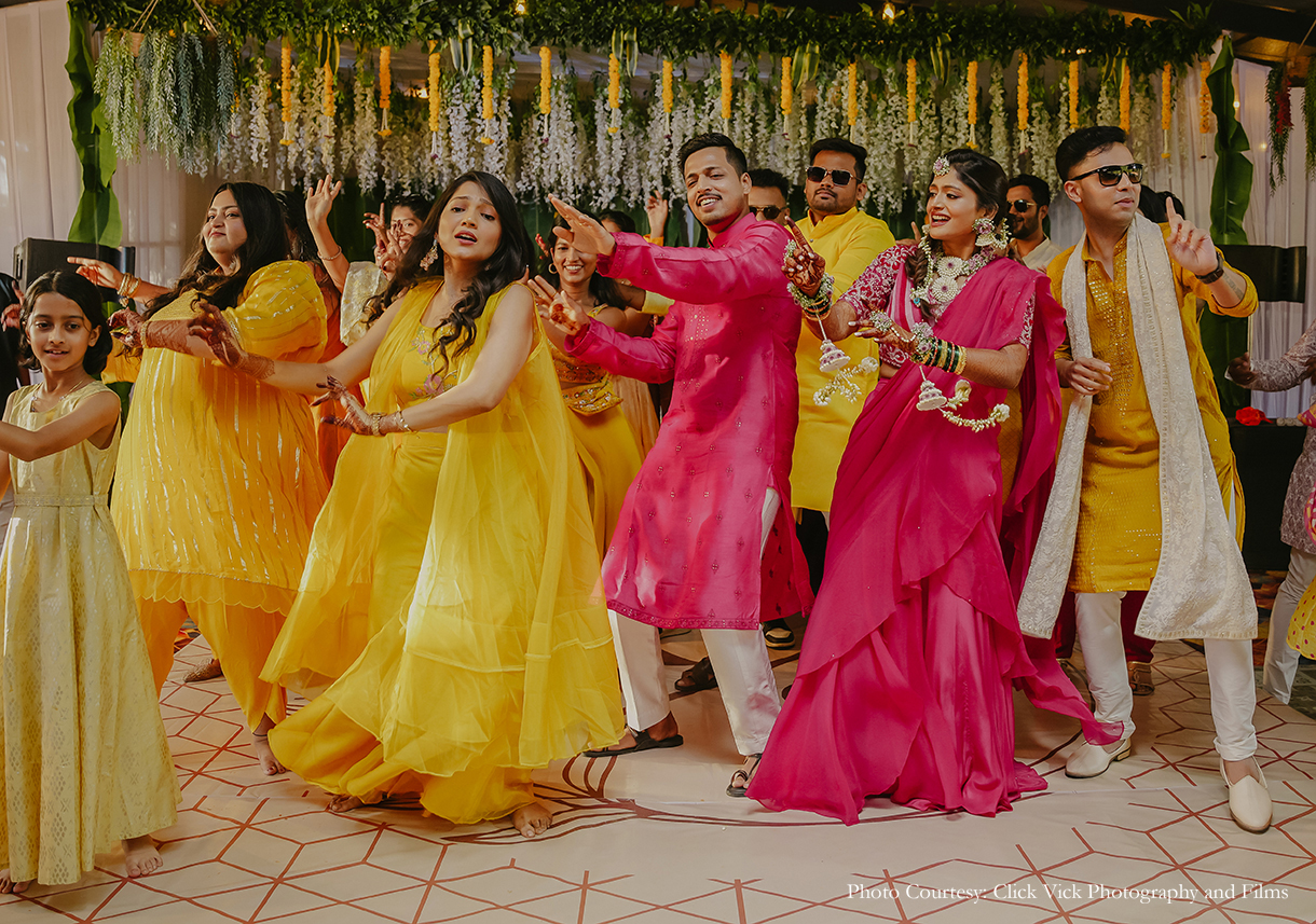 Adorned with pops of colors and blooms, the mehndi ceremony was a vibrant one. A floral arch adorned the bridal seating area and the couple made a dashing entry with their loved ones holding up sparklers to welcome them.