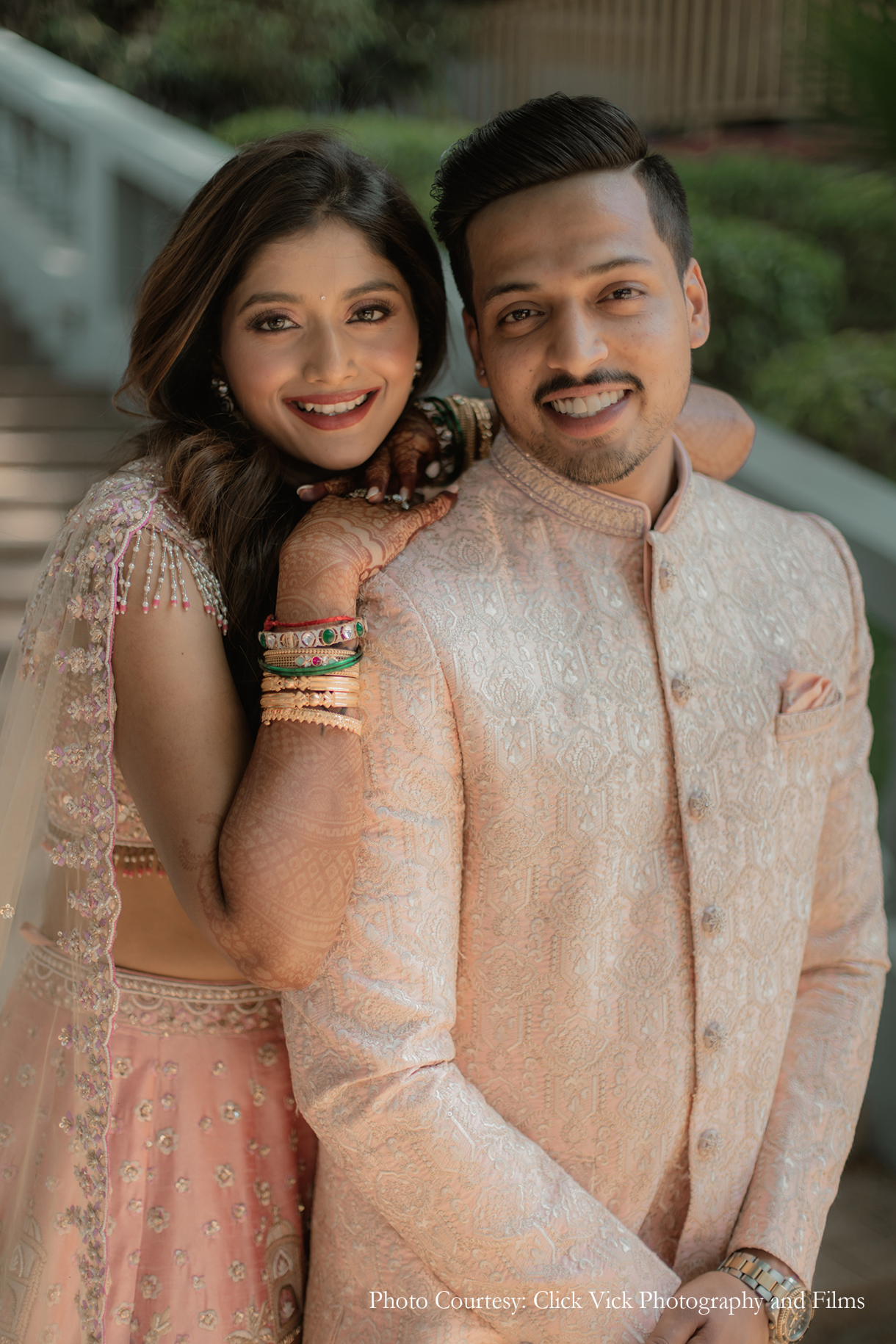 Sparshika shares, “We met through our mutual friend. We’d been talking on Instagram for a while and hadn’t gotten a chance to meet since I live in Mumbai and he is based in Pune. One day he surprised me by visiting Mumbai and we planned a day out. We dated for a couple of years before we took the plunge.”