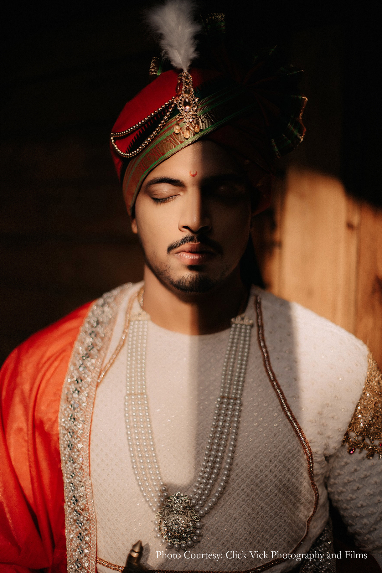 Sparshika shares, “Since we’re both Maharashtrians, we wanted to embrace our culture completely at the phera ceremony. I wore a ‘nauvari’ saree with zari work while Rushikesh donned a dhoti-kurta set with a turban. We’re immensely proud of our roots and wanted to honor it on this special day by showcasing our vibrant traditions. My jewellery followed a traditional route as well with a pearl nathni, a thushi necklace along with several other pearl jewels.