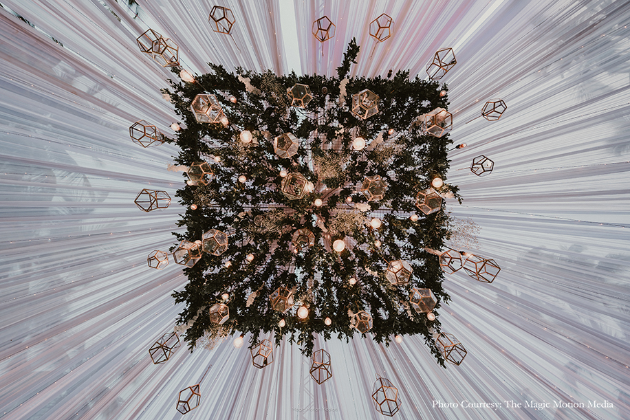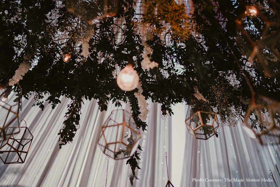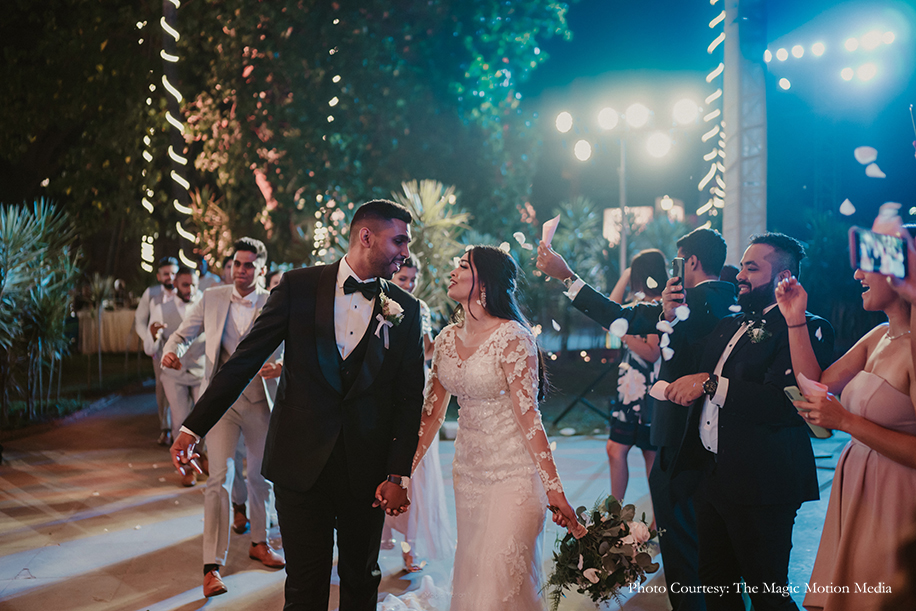 The wedding was followed by a formal reception dinner at the Bay 15 Beach resort in Panaji. The spectacular canopy atop the dance floor was decorated with fairy lights, Edison bulbs, and crystal hangings intertwined with foliage and flowers. The white and gold three-tier cake topped with fresh flowers from Sweet Rhapsody was a show stopper. Heartfelt speeches and champagne toasts were followed by a night of fun and dancing as everyone enjoyed to their hearts’ content.