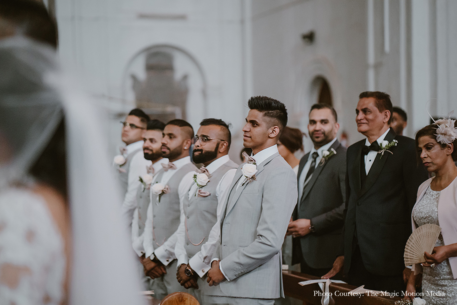 The wedding festivities began at the beautiful Bay 15 Beach Resorts with adorable bridesmaids and groomsmen shoots while the couple got ready for the function. The candid clicks captured the fun and joy that Stacey and Ruel felt with their friends as they embarked on a new journey. The groom’s gang looked dapper in pewter grey waistcoats and trousers accessorized with white boutonnieres and vintage pocket watches. The bridesmaids donned breezy blush dresses. The ceremony took place in a traditional setting in a church, followed by the bouquet toss and a couple photoshoot atop the hill against the setting sun.