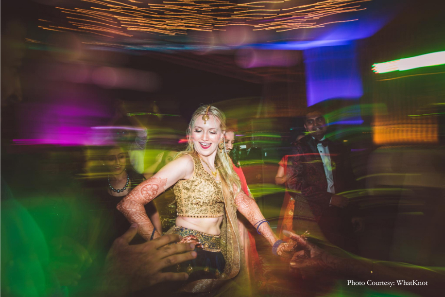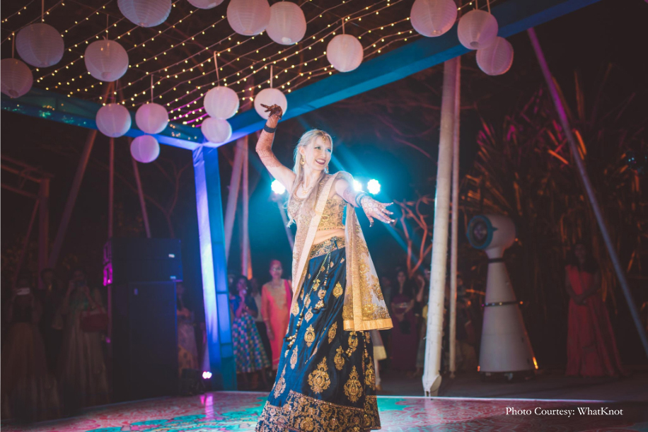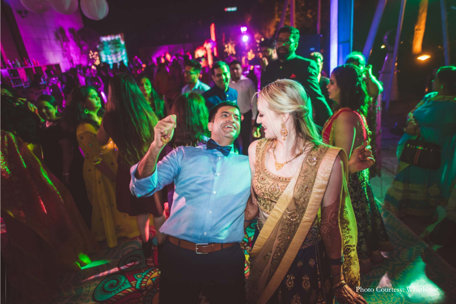 The white wedding was followed by an exhilarating sangeet ceremony in the evening which saw participation from all of the couple’s family members and guests. The bride even surprised the groom with a special solo dance performance and group dances which they’d learned via video tutorials from the choreographer. Sunil was left stunned with Stephanie’s performances and then she did something incredibly sweet as her display of affection for him. She had arranged for a special cake which displayed his alma mater – The New York University. The evening ended on a cheerful note with the couple enjoying every moment of it.
