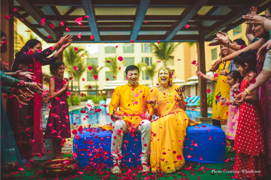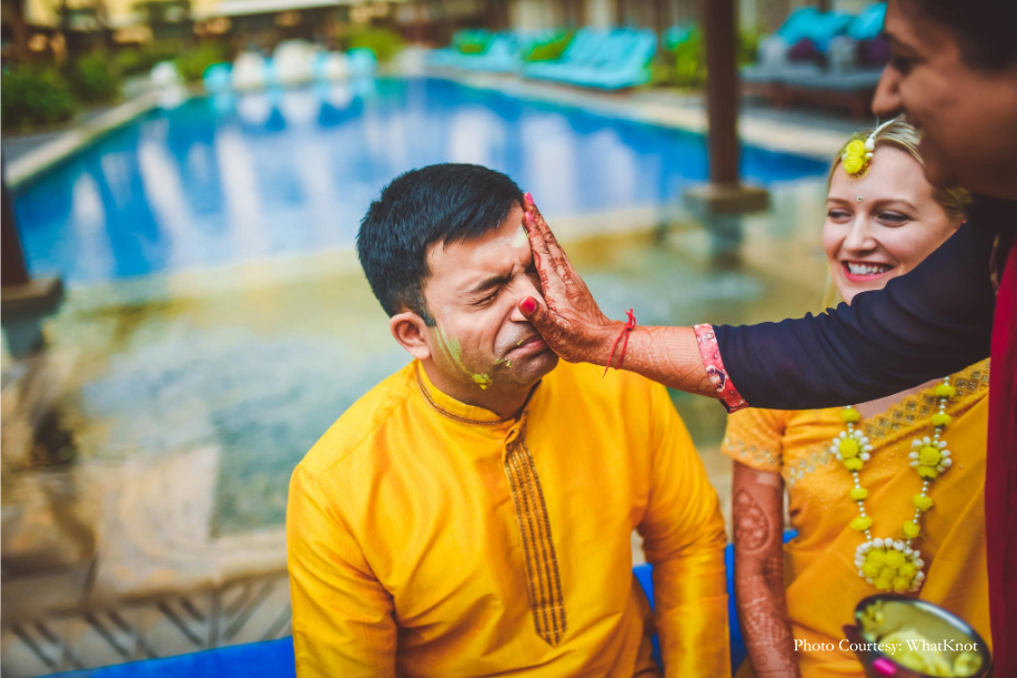 The wedding festivities continued with the haldi ceremony being the next one. The bright yellow outfits donned by the bride and groom reflected the happy glow on their faces. Stephanie accentuated her yellow saree with matching floral jewellery. The couple couldn’t stop smiling as their family members colored their faces with turmeric paste and showered them with rose petals.