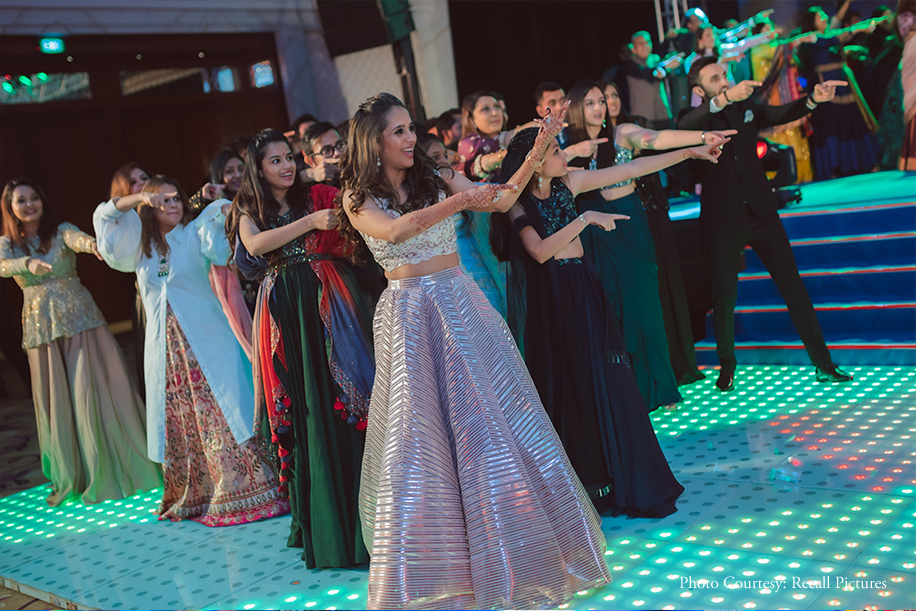 Rocking performances choreographed by the bride’s sister dazzled the guests at this couple’s vibrant Sangeet.