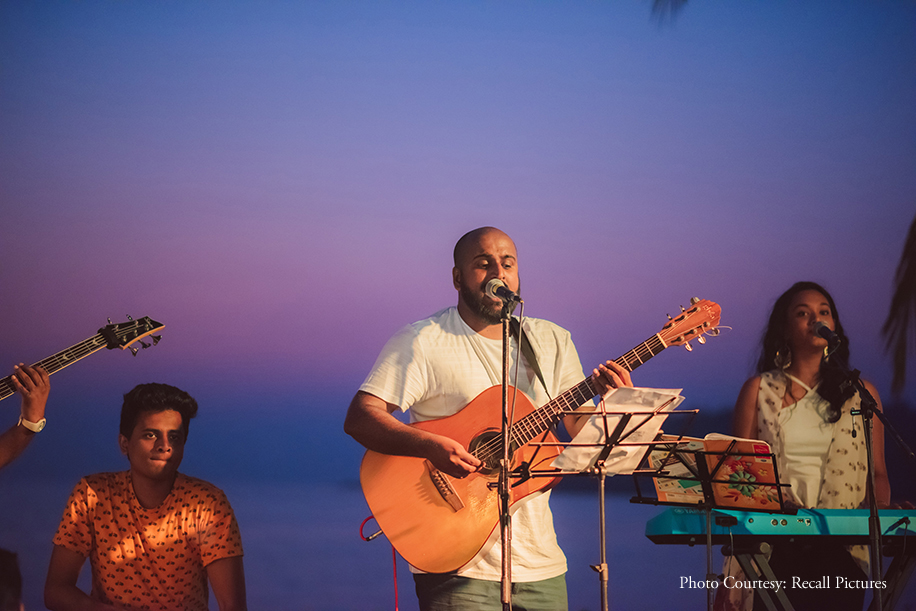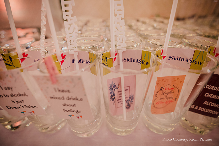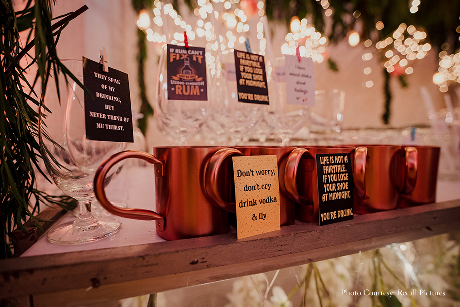 The festivities kicked off with a bohemian sundowner Mehndi. With a vibrant color palette of peaches, pinks, yellows and reds, the function saw myriad fun teamed up with quirky elements such as teepees, lanterns, marquee lights and more. The acoustic band ‘Peaking Panda Music’ serenaded the guests with ambient music that set the mood, as they helped themselves to delectable finger food. The couple sported breezy, chic outfits by Payal Singhal for this function.
