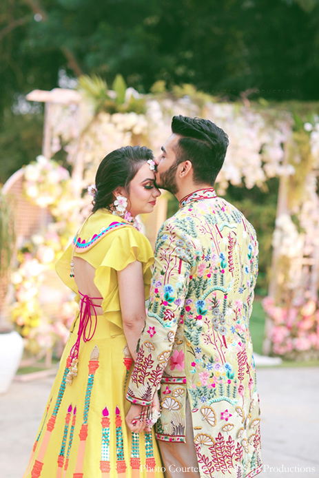 The mehndi ceremony was a sundowner at Shangri-la Eros Hotel, New Delhi, as both Vani and Sumit wanted to keep things light and different. The theme was ‘Colorful and Rustic’, and the decor included a huge ice bar with the couple’s hashtag, #IfoundSumVan, placed near the entrance. Members from both families put up heartfelt dance performances for the couple which was followed by live music by Bombay Rockers. The bride looked stunning in a yellow lehenga by Apurva Motwaani, she later changed into an outfit by Sankiahit by Sandhya Gambhir Ahuja, and Sumit complemented her in his floral, asymmetrical bandh gala ensemble by Dieeu & Orr.