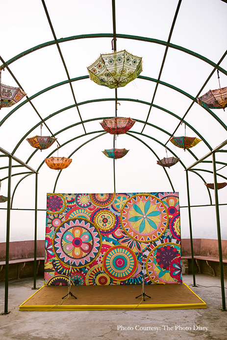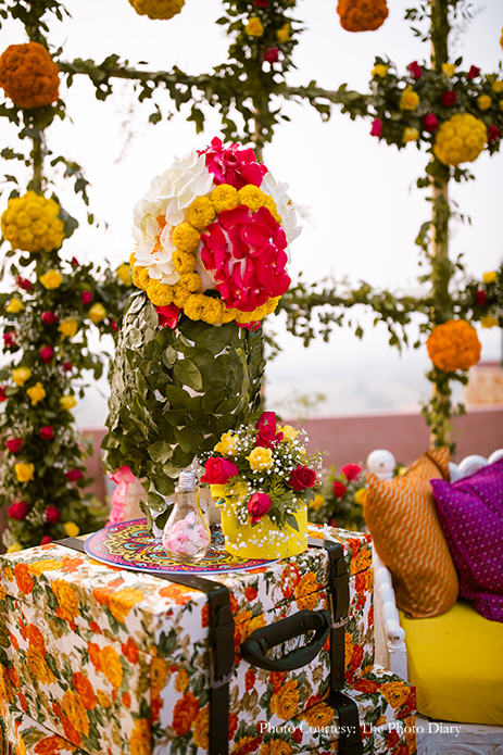 The first function was a sundowner mehendi that progressed onto the sangeet. With a giant Jenga game setup, a priest with a fortune-telling parrot, UNO and assorted board games, the evening was filled with fun activities for everyone. The sangeet included a performance by traditional Rajasthani dancers and musicians. The culinary offerings featured live counters and snacks such as popcorn, candy floss, chaat, and kullad biryani among others.