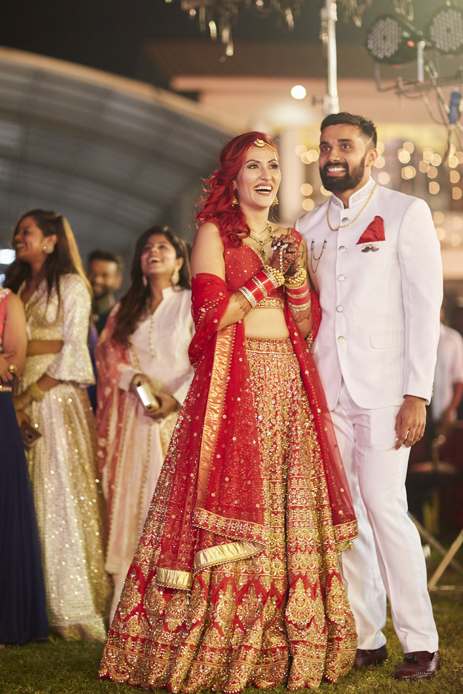 “We hosted our wedding at The Army Officers Club at Juhu the next day, and I entered the venue with my bridesmaids to the song, ‘Din Shagna’ playing in the background, just like I always imagined! A moment that will always hold a special place in my heart is when I first saw Dhruwin with tears pooling in my eyes and saw him teary-eyed too! Our mandap was exactly how I wanted it to be, lit with nature’s best! And as for my ensemble, I was anything but the ‘typical bride,’ though I wore a traditional red lehenga with elaborate gold jewellery, I flaunted my red hair and 13 tattoos.”