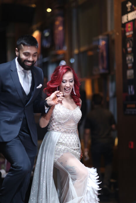 “The following evening, we hosted the sangeet at the Hardrock Cafe which was hands down the most epic night ever! Our invites for the event read, ‘Glam Up and Dance’ and that’s honestly what we all did! I wore my favorite color, white that night and with intricate embroidery, sheer fabric, and feathery elements, my outfit was a masterpiece. With most of my friends being amazing dancers, naturally, there were some performances lined up. However, my most special and unforgettable dance was the one with my father. Everyone walked out of the hall with sore feet and blurry memories!”