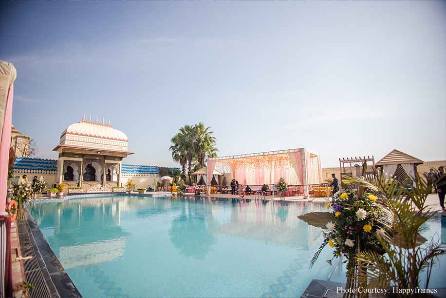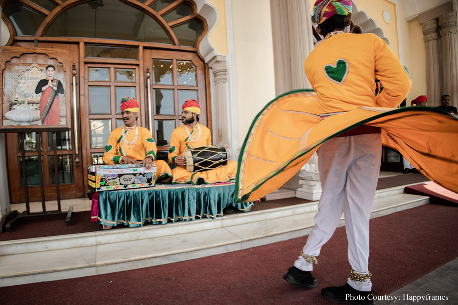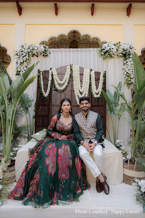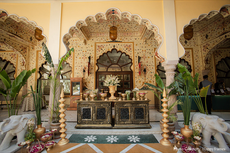 The traditional jharokas and Rajasthani folk performers gave the mehndi event a traditional vibe. The decor was kept simple with the lush surroundings highlighting the bright hues of everyone’s outfits. White blooms, banana leaves and green hues merged seamlessly with the venue.