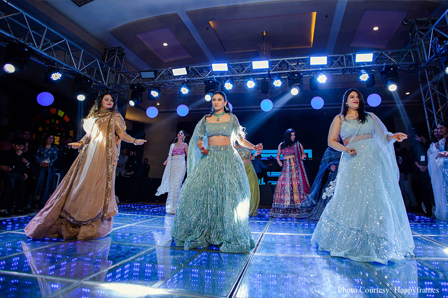 After the simple mehndi, the couple hosted a glam sangeet the following evening. The indoor venue was lit up by LED lights, mesmerizing digital backdrops and an acrylic dancefloor where their family members performed. The bride seated on her dusty rose-hued couch flanked by blooms had a gala time watching her loved ones perform and later, even went up to the DJ booth to play a mix of chartbusters for the wedding party.