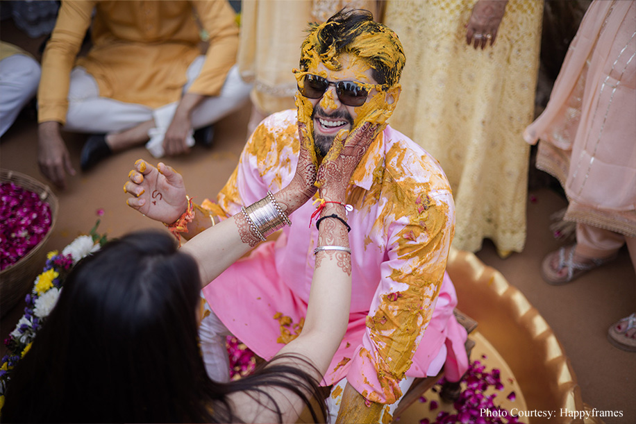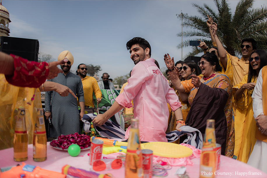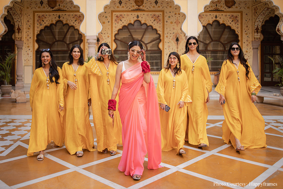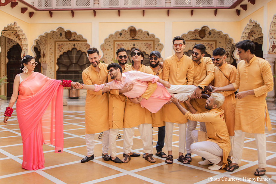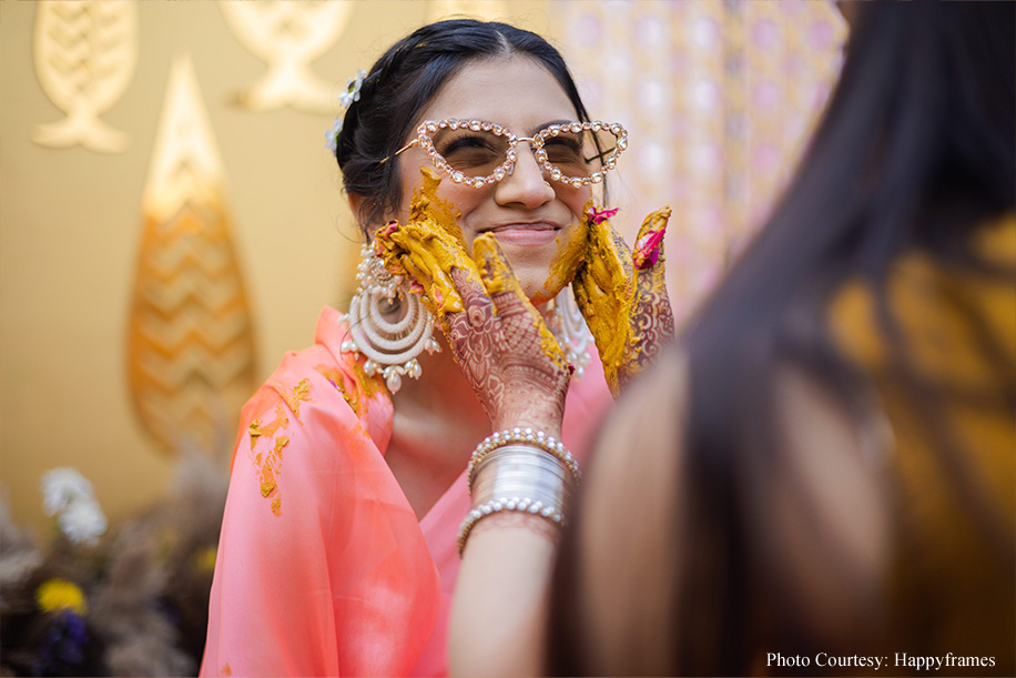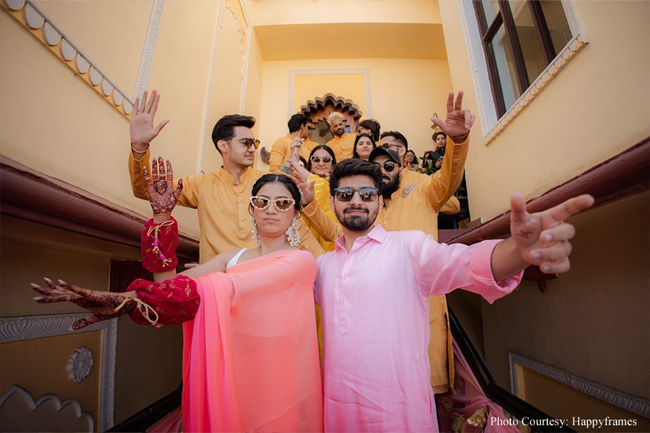 The couple shares, “The haldi was the standout event for us as everything fell into place seamlessly! Taking the colour-coordinated attires to the next level, each friend and family member had customized hashtags on their outfits, like, ‘mere yaar ki shaadi hai’, and ‘Dulhe ki Behen’, to name a few. As a result, the pictures at this event were so fun! Plus, everyone was at their playful best.”