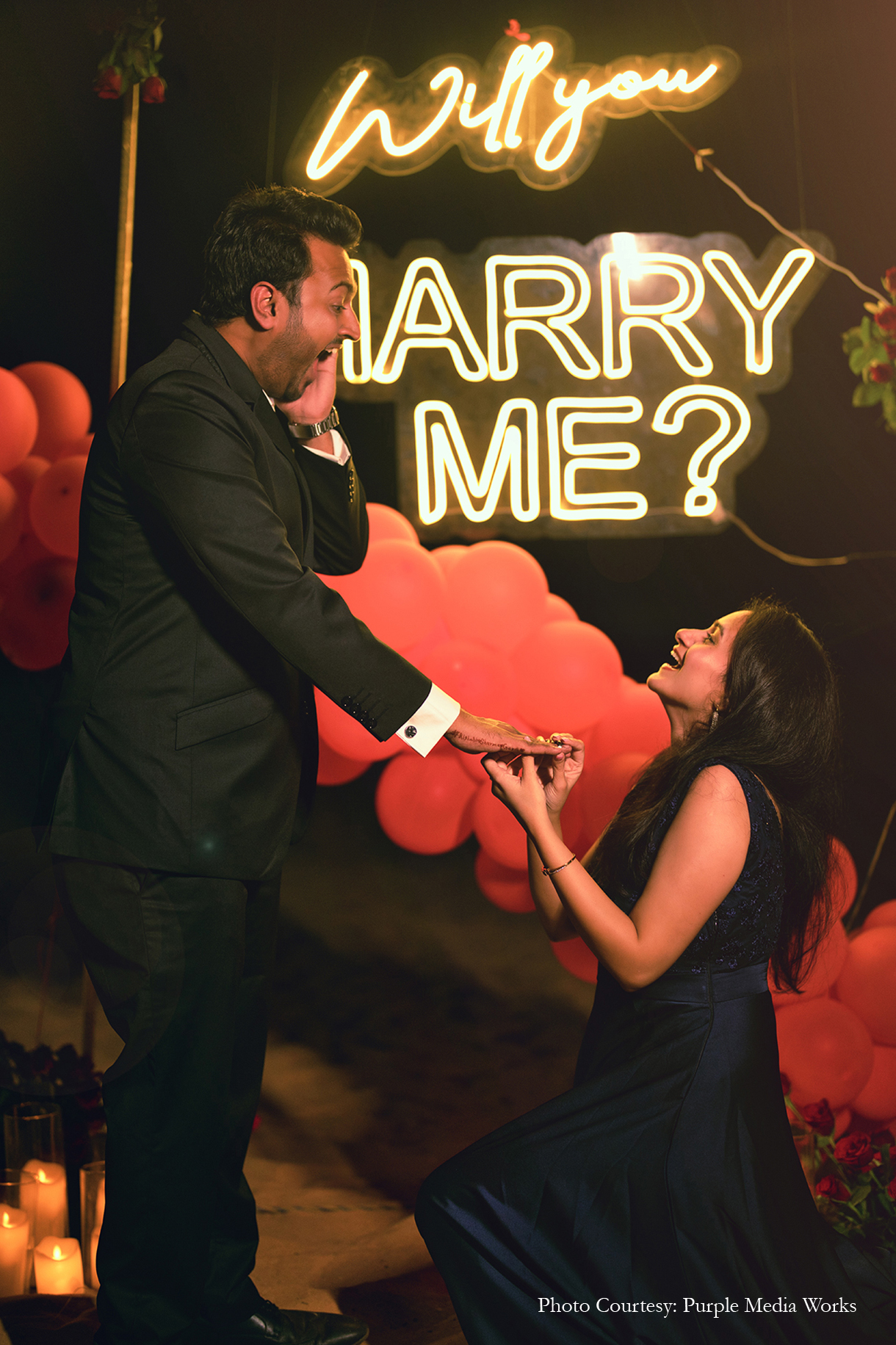 Aditya Bajaj from Bon Evento shares, “The celebration kicked off with an impromptu proposal that Rishabh had long dreamt of, creating a cozy, magical moment for Swati. We crafted a special decor for this unforgettable proposal, featuring LED lettering spelling out ‘Will you marry me?’ accompanied by red balloons. Set against the serene backdrop of the beach, it was the perfect setting for Rishabh to present Swati with a ring and raise a toast to their love.”