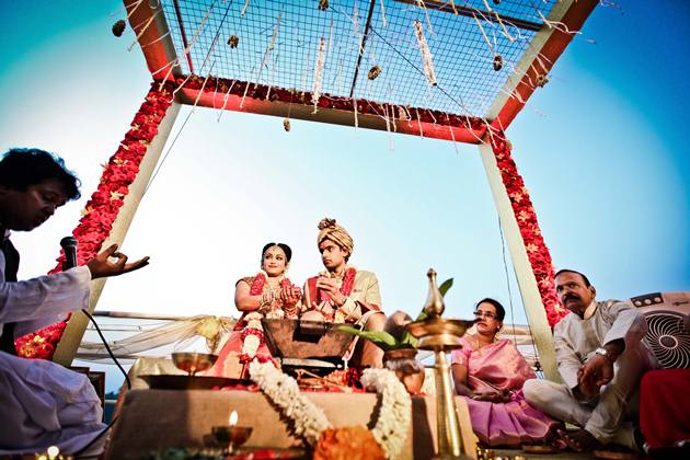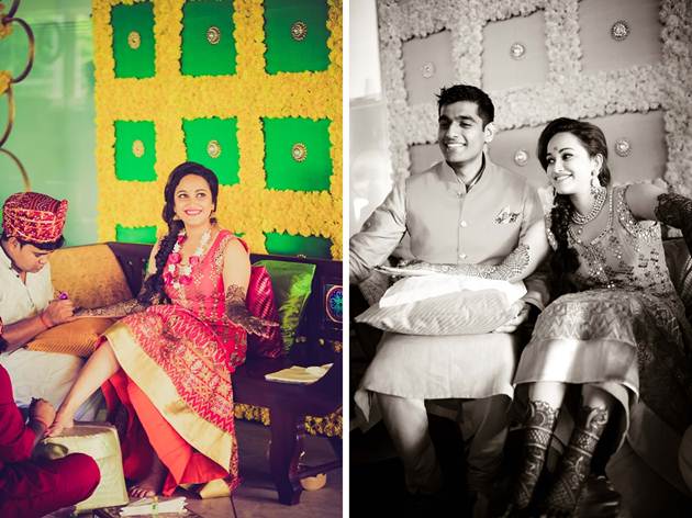 Swetha and Karan’s celebrations featured all the traditional Indian wedding ceremonies, starting with a simple mehndi ceremony, keeping in mind that several guests had travelled the previous night or were arriving only that morning. Says Swetha, “To keep people out of the sun, we hosted it in a covered patio area of the hotel, festooned with green parrots and yellow flowers. More pops of color with colorful bangles, takeaways and bright mocktails complemented the theme. The food was light; the chef created interesting, colorful chaat which was absolutely delicious!”