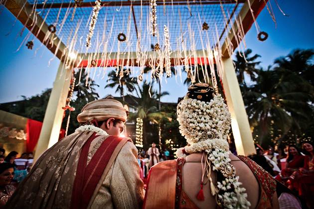 Having chosen Kollam for its breathtaking backwaters, the couple decided to have their wedding ceremony on the water itself, with a perfect blend of cultures and traditions from the North (Karan) and the South (Swetha). Swetha remembers how they discussed the dream-like floating mandap with the planner, “We wanted a red and gold colour scheme, a mandap filled with red roses, the view of the breathtaking backwaters as backdrop.” Wearing a gold sherwani with red trim, Karan rode an elephant as he entered with his baraat. The arrival of the beautiful bride, wearing a classic red Kanjeevaram and traditional temple jewellery was announced by a 10 piece instrument, the ‘panchavadyam’. As a perfect sunset unfolded behind them, the jaimala ceremony was conducted and the couple walked to the mandap to exchange vows following the Arya Samaj traditions.